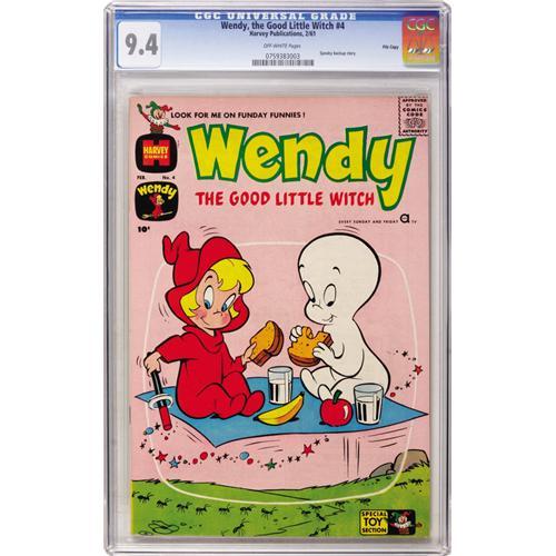 <B>Wendy, the Good Little Witch #4 File Copy (Harvey, 1961) CGC NM 9.4 Off-white pages.</B></I> File copy is the finest of #4 that CGC has certified to date. The issue had a backup Spooky story. Overstreet 2006 NM- 9.2 value = $135. CGC census 3/07: 1 in 9.4, none higher. <I> From the Cary and Cheryl Porter Collection.</B></I><BR><BR><b>Shipping:</b> Comics - Slabbed (certified) (<a target="_blank" href="http://www.heritageauctions.com/common/shipping.php">view shipping information</a>)