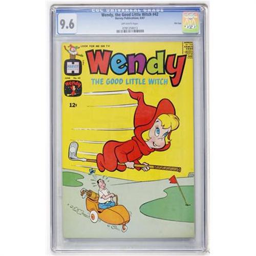 <B>Wendy, the Good Little Witch #42 File Copy (Harvey, 1967) CGC NM+ 9.6 Off-white pages.</B></I> Overstreet 2007 NM- 9.2 value = $32. CGC census 1/08: 2 in 9.6, none higher.<BR><BR><b>Shipping:</b> Comics - Slabbed (certified) (<a target="_blank" href="http://www.heritageauctions.com/common/shipping.php">view shipping information</a>)