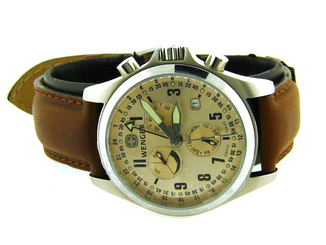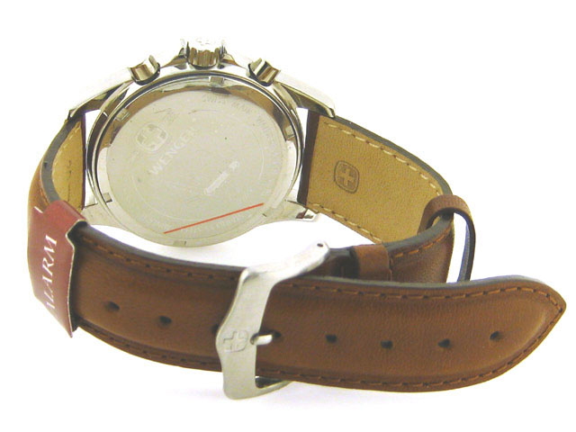 This is a Wenger Men's 72750 TerraGraph Dual Time Power Reserve Alarm Swiss Watch with the following features: Round item shape; Mineral dial window type; Analog display type; Buckle clasp; Stainless steel case material; 40 mm (case diameter) X 11.7 mm (case thickness); Leather band material; 20 mm Band width; Brown band color; Silver dial color; Stainless Steel bezel material; Stationary bezel function; Date calendar; Luminous; Swiss quartz movement; and Water resistant to 330 feet in depth.