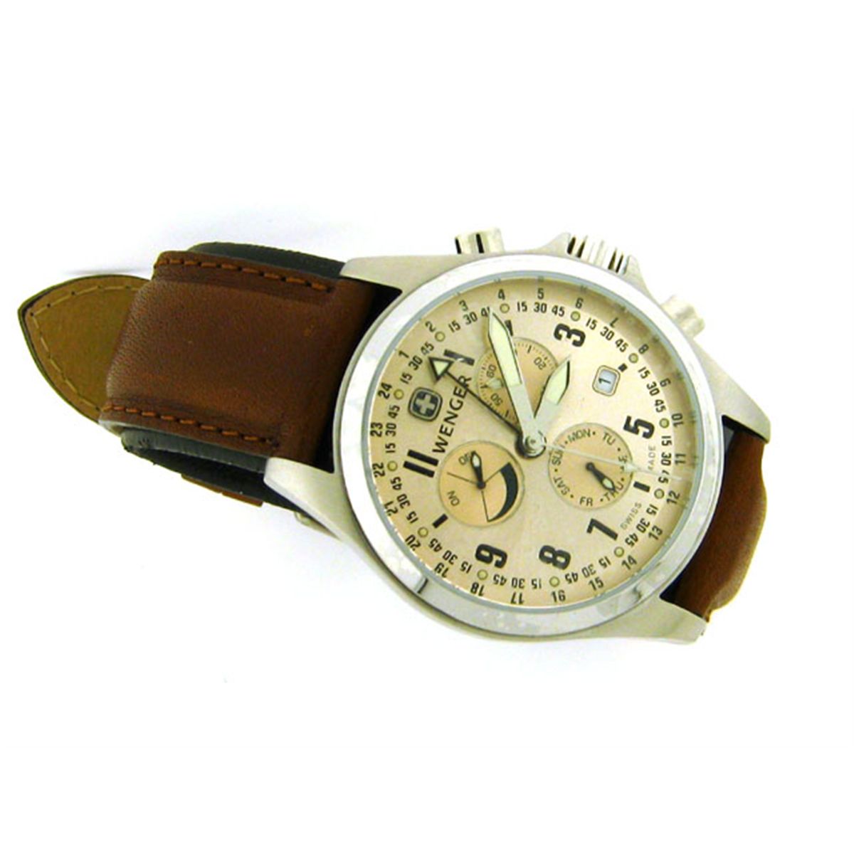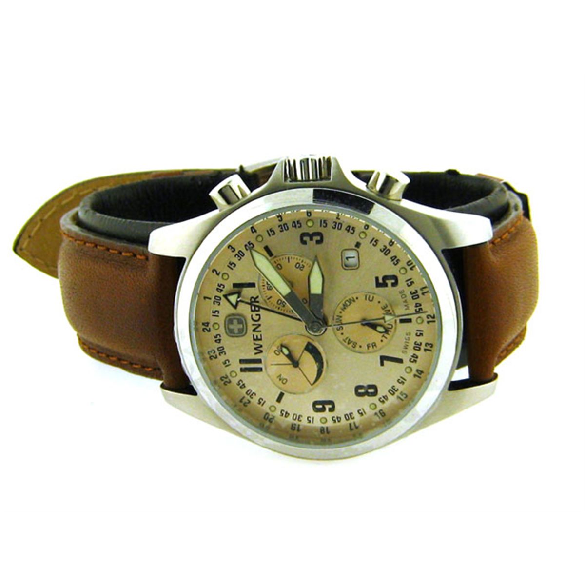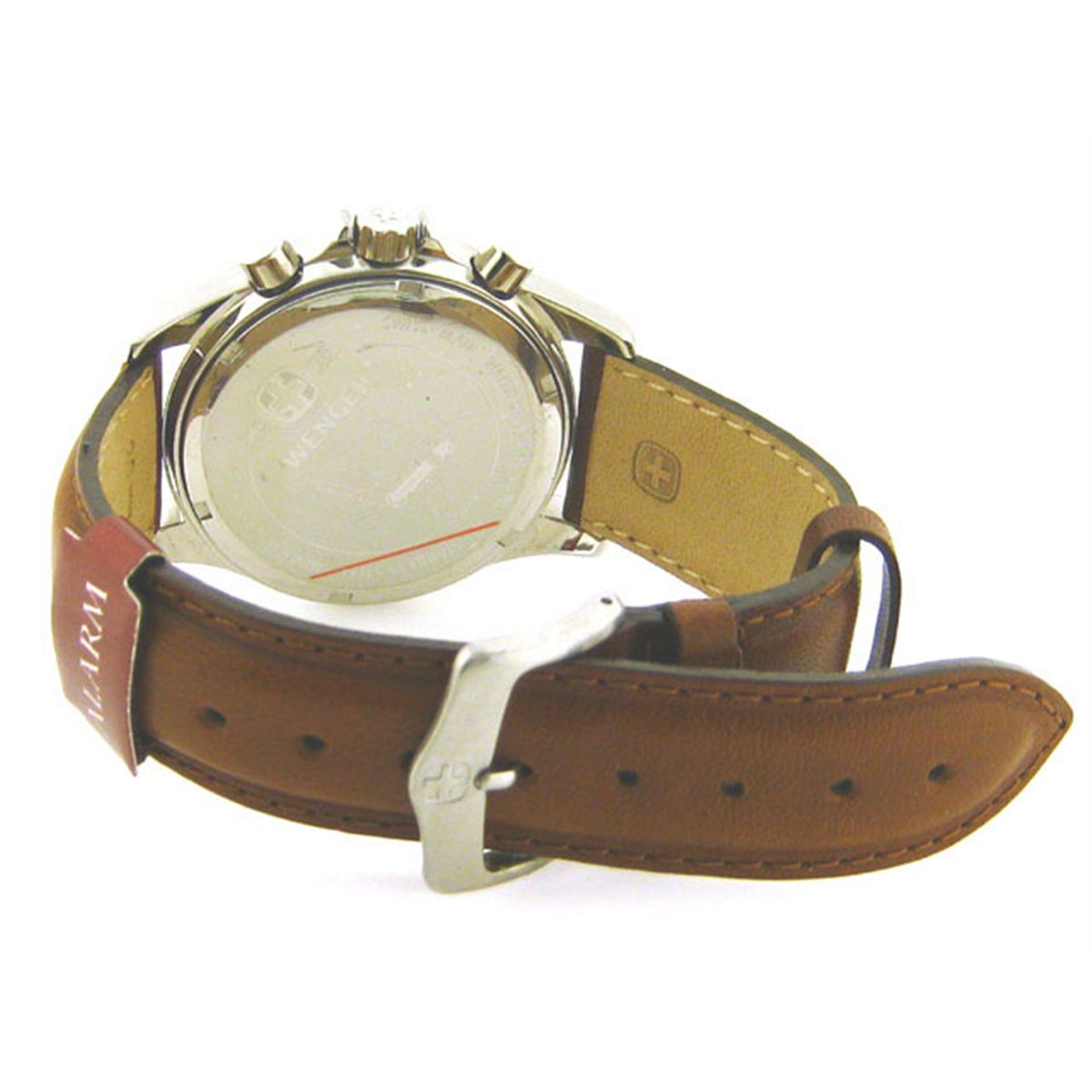 This is a Wenger Men's 72750 TerraGraph Dual Time Power Reserve Alarm Swiss Watch with the following features: Round item shape; Mineral dial window type; Analog display type; Buckle clasp; Stainless steel case material; 40 mm (case diameter) X 11.7 mm (case thickness); Leather band material; 20 mm Band width; Brown band color; Silver dial color; Stainless Steel bezel material; Stationary bezel function; Date calendar; Luminous; Swiss quartz movement; and Water resistant to 330 feet in depth.