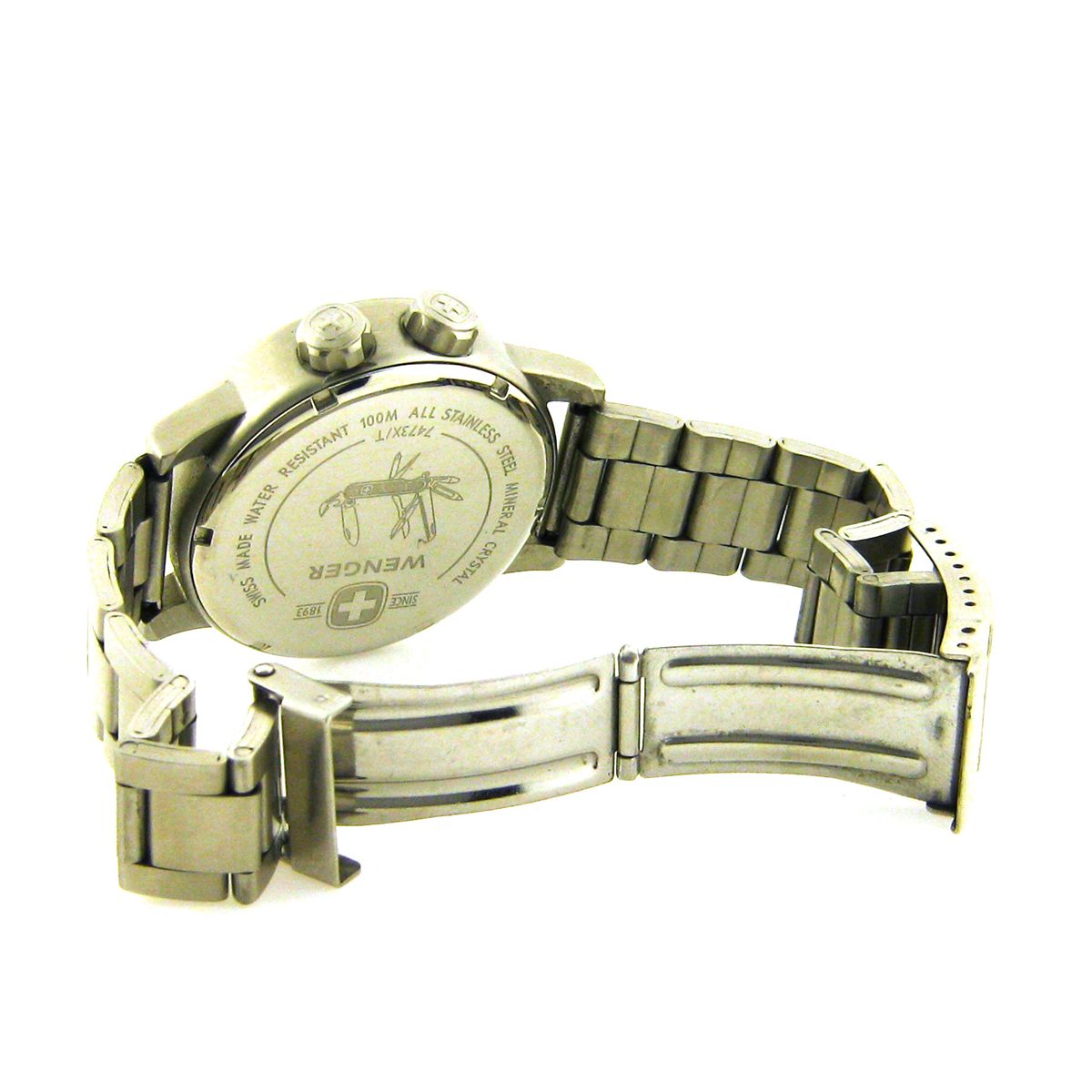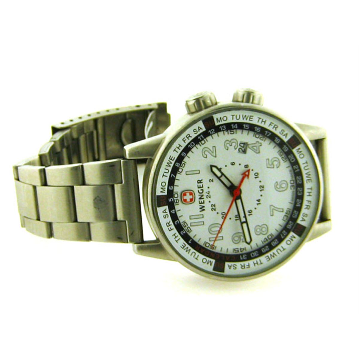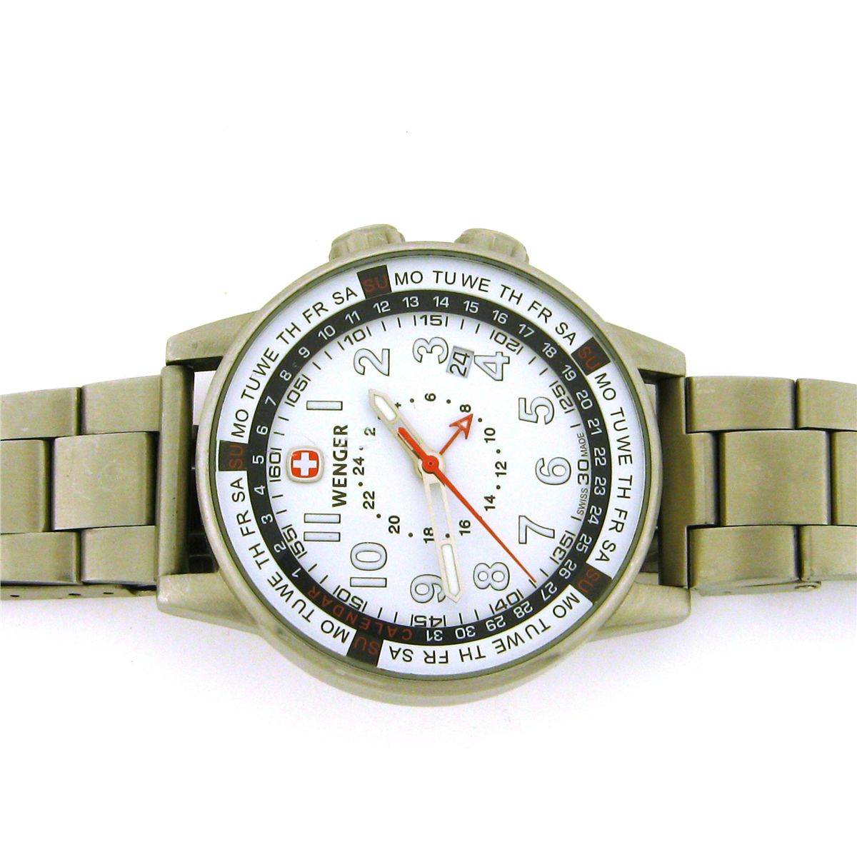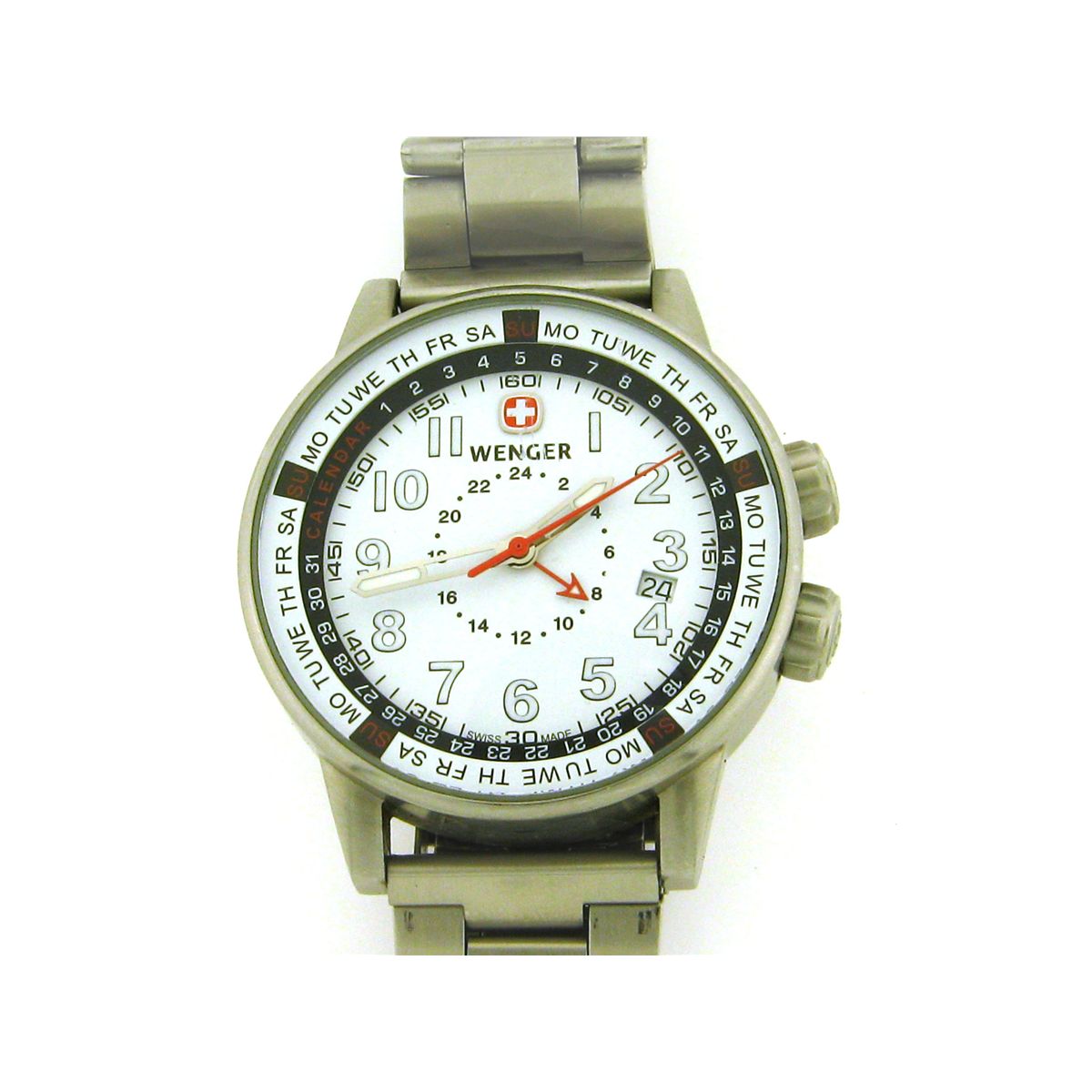 This is a Wenger Men's Calendar Series Watch with the following features: Mineral dial window; Buckle clasp; Stainless steel case material; 42 mm (case diameter) X 13.3 mm (Case thickness); 20 mm Band width; Black band color; White dial color; Stainless steel bezel material; Stationary bezel function; Day-date-and Month calendar; Luminous; Quartz movement; and Water resistant to 330 fee in depth.
