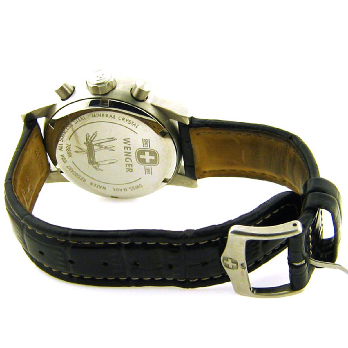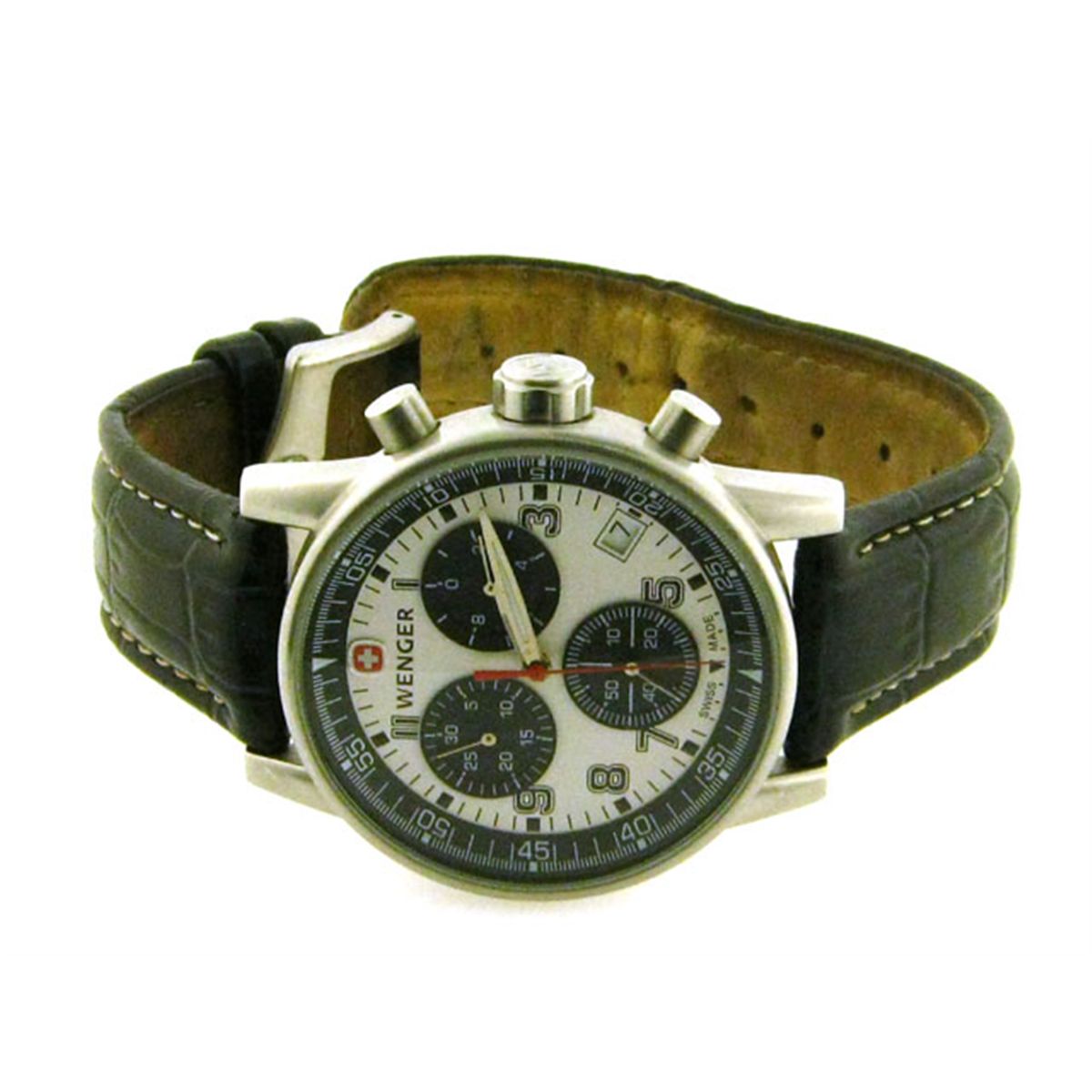 This is a Wenger Men's Commando Chrono Swiss Watch with the following features: Mineral Dial window material type; Analog display type; Buckle clasp; Stainless Steel case material; 46 mm (case diameter) X 13.7 mm (case thickness); Leather band material; 21 mm Band width; White dial color; Stainless steel bezel material; Stationary bezel function; Date calendar; Swiss quartz movement; and Water resistant to 330 feet.