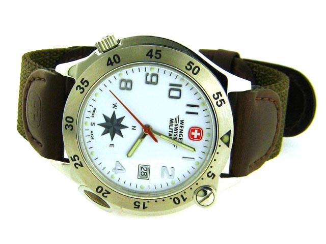 This is a Wenger Swing Out with the following features: White Dial; Swiss quartz movement accurate to 1/10 of a second per day; Water-resistant to 50m (165 ft.); Swing-out case; Engraved elapsed minutes on bezel; Date display; Luminous hands and markers that recharge in seconds; Scratch-resistant mineral crystal; Stainless steel case with screw-on back ensures water-resistance; Rugged nylon strap with leather accents; Case size: 41mm; and Lug width: 20mm.