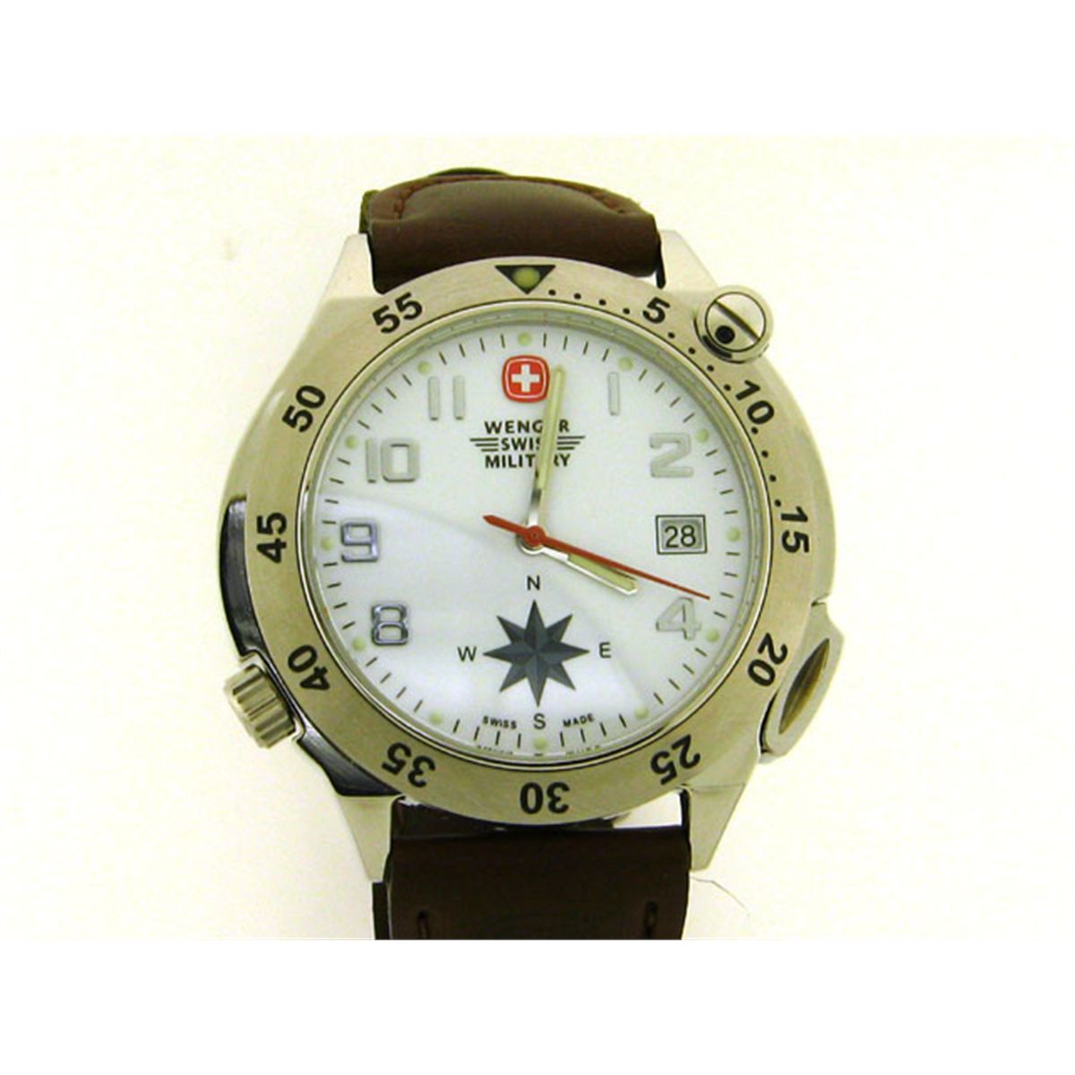 This is a Wenger Swing Out with the following features: White Dial; Swiss quartz movement accurate to 1/10 of a second per day; Water-resistant to 50m (165 ft.); Swing-out case; Engraved elapsed minutes on bezel; Date display; Luminous hands and markers that recharge in seconds; Scratch-resistant mineral crystal; Stainless steel case with screw-on back ensures water-resistance; Rugged nylon strap with leather accents; Case size: 41mm; and Lug width: 20mm.