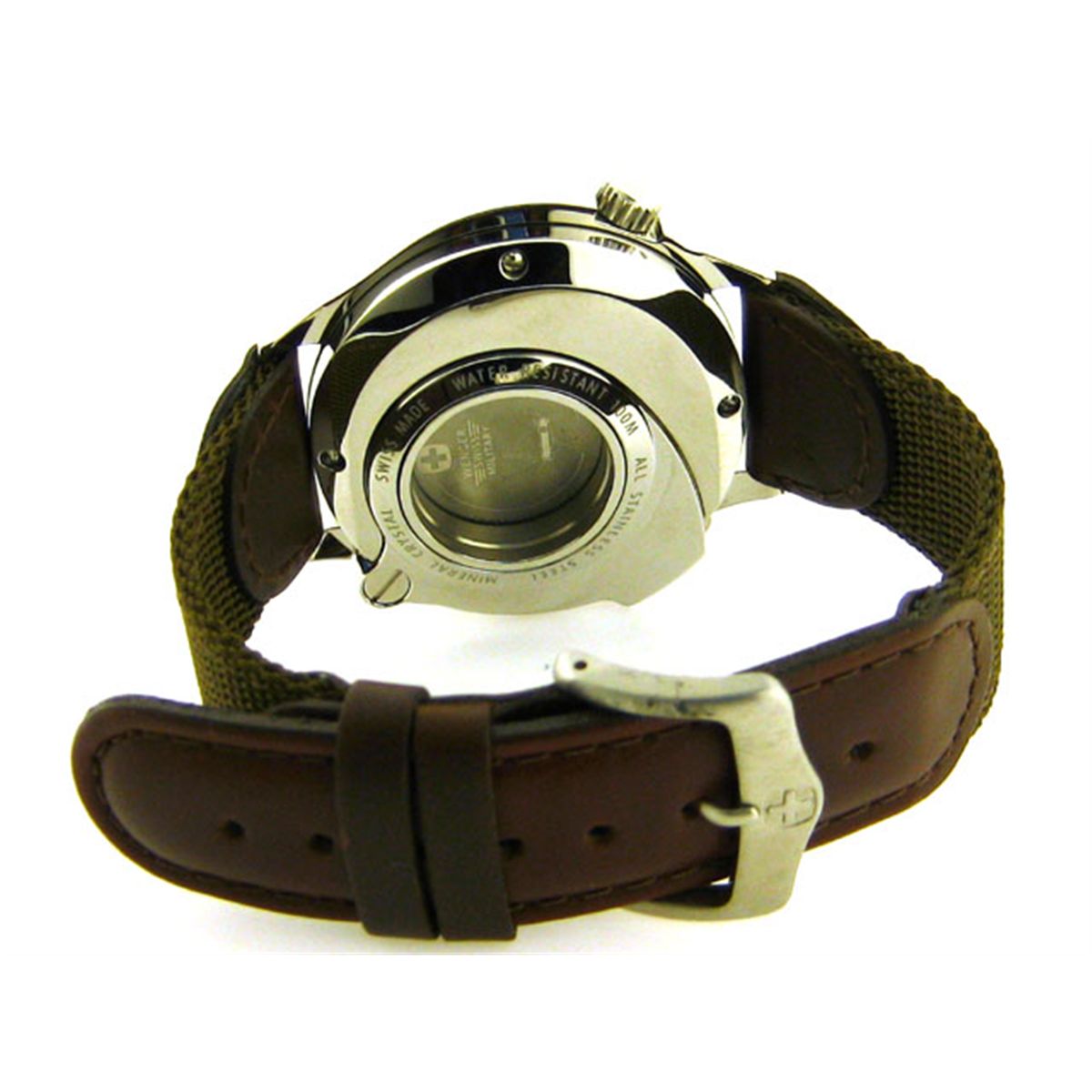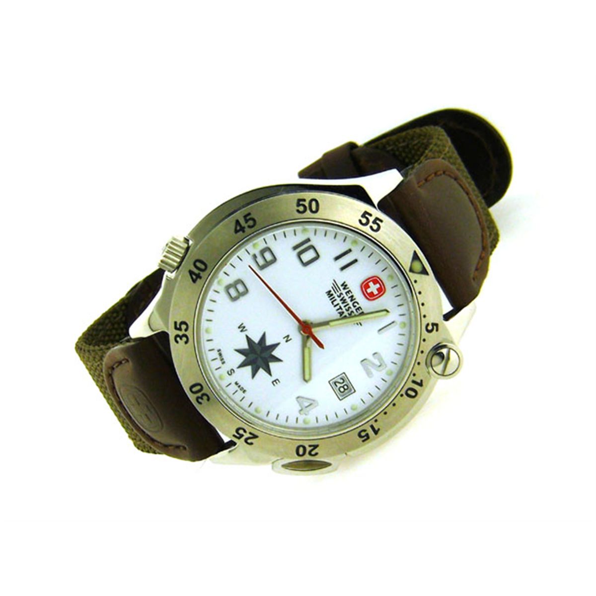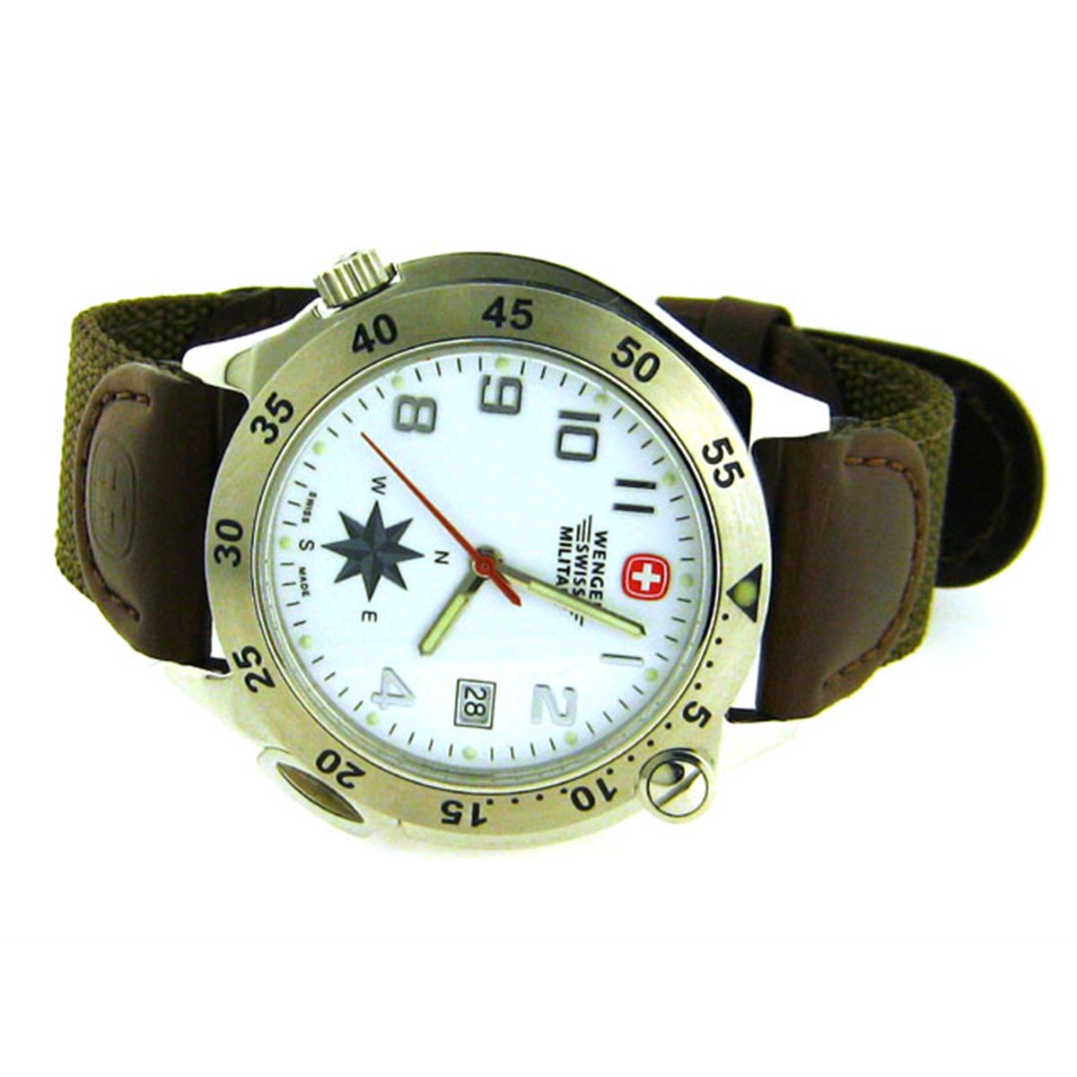 This is a Wenger Swing Out with the following features: White Dial; Swiss quartz movement accurate to 1/10 of a second per day; Water-resistant to 50m (165 ft.); Swing-out case; Engraved elapsed minutes on bezel; Date display; Luminous hands and markers that recharge in seconds; Scratch-resistant mineral crystal; Stainless steel case with screw-on back ensures water-resistance; Rugged nylon strap with leather accents; Case size: 41mm; and Lug width: 20mm.