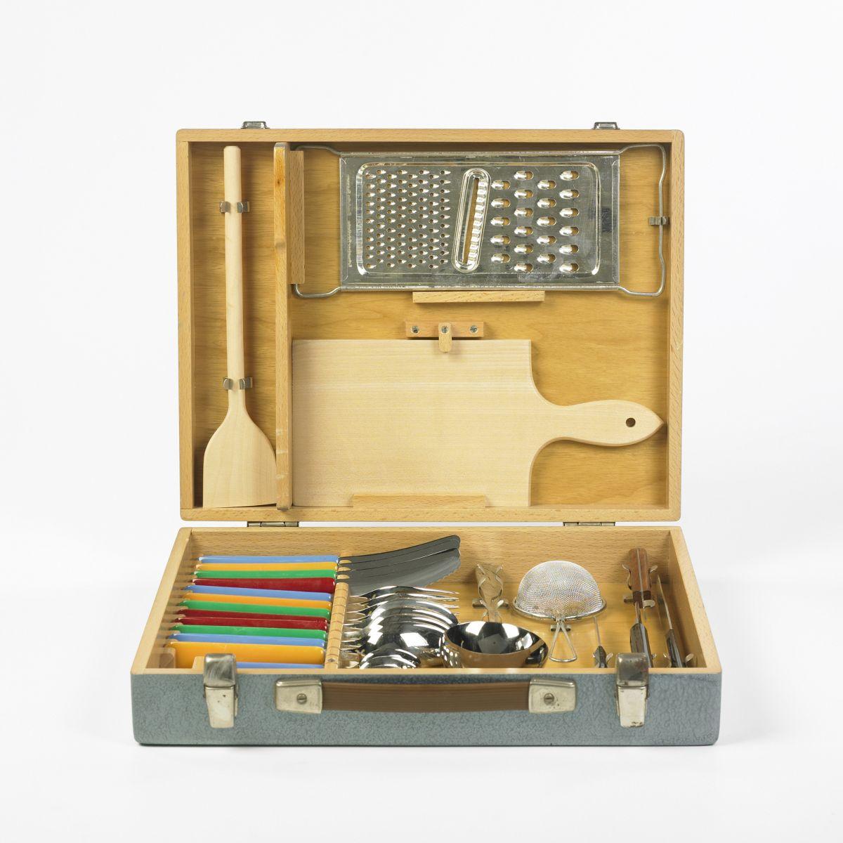 Set includes: four piece service place setting for four, two knives, a can opener, peeler, cutting board, wooden spoon, ladle, strainer and grater: twenty-five items total. Signed with impressed manufacturer's marks: [Wenger Switzerland].