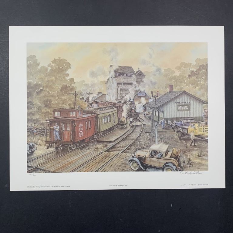 Wentworth Folkins' "Train Time at Unionville" limited edition print, signed lower right and numbered 139/300. This piece is of a busy train station in Unionville, Ontario, with cars, trains and cabooses. This piece is in mint condition.