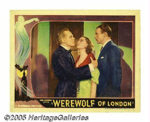 <B>WereWolf of London (Universal, 1935).</B></I> Lobby Card (11" X 14"). This is one of the original horror classics from Universal Studios. Henry Hull was cast as the accursed scientist and Warner Oland as his nemesis. Jack Pierce created a true masterpiece of horror makeup in the transformation scenes. There are two pinholes per corner, one pinhole in the upper graphics, minor corner creases and trivial border soiling. Lobbies for this classic Universal horror film are extremely rare. Very Fine.