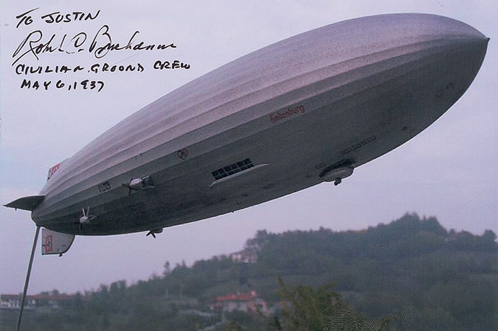 Cardstock 10 x 8 photo of the Hindenburg in flight, signed in black felt tip by Werner Franz; and a 6 x 4 cardstock photo of the zeppelin, signed and inscribed in black felt tip, “To Justin, Robert C. Buchanan, Civilian ground crew, May 6, 1937.” In fine condition.