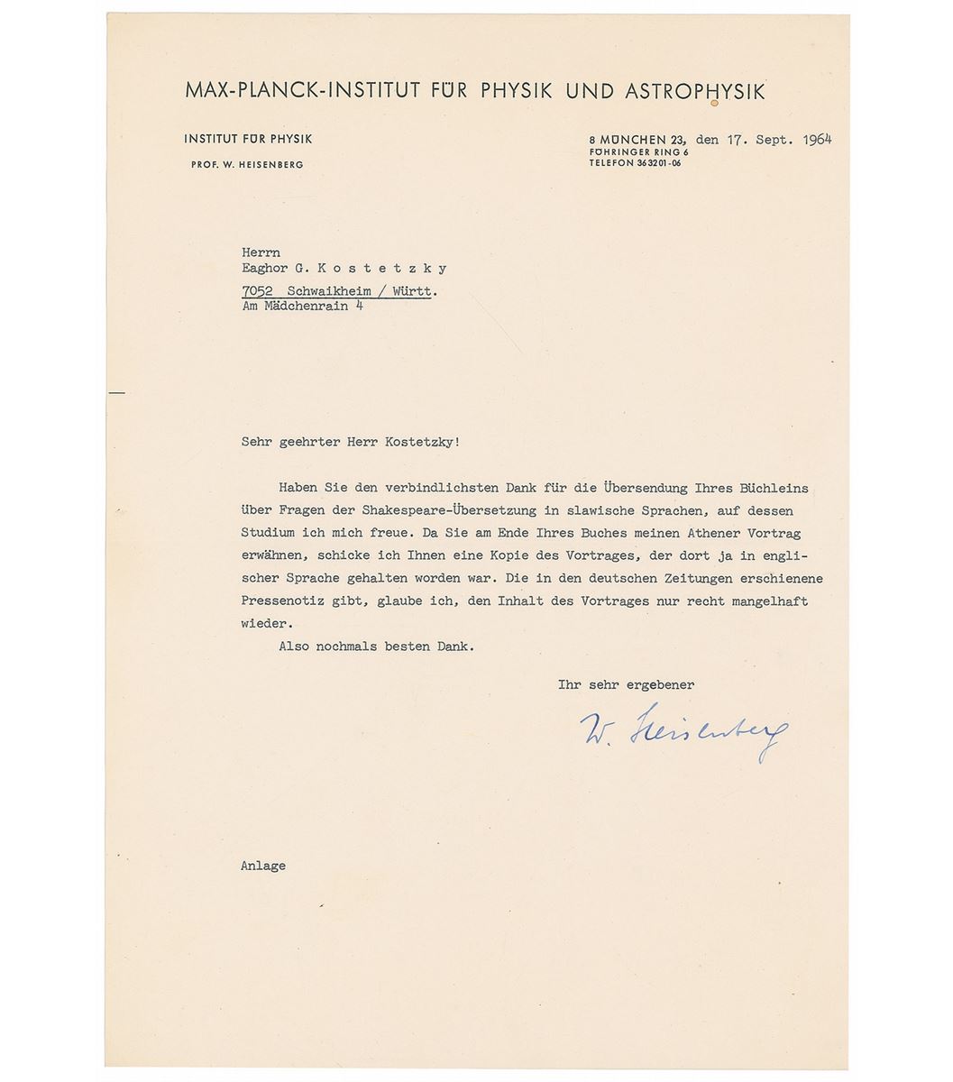 TLS in German, signed “W. Heisenberg,” one page, 8.25 x 11.5, Max Planck Institute for Physics and Astrophysics letterhead, September 17, 1964. Letter to Ukrainian writer and publisher Ihor Kostetsky, in full (translated): “Thank you for sending me your pamphlet about questions of translating Shakespeare into Slavic languages. I am looking forward to reading it. Since at the end of your letter you mention my Athens presentation, I am sending you a copy of the presentation, which was given in English. The write-up in the German papers, to my mind, is flawed in its presentation of the content of the presentation.” In fine condition. On June 3, 1964, Heisenberg delivered a lecture titled 'Natural Law and the Structure of Matter' before a distinguished crowd at the Greek Hill of Pynx in Athens; it was published shortly thereafter in Frontiers of Modern Scientific Philosophy and Humanism.