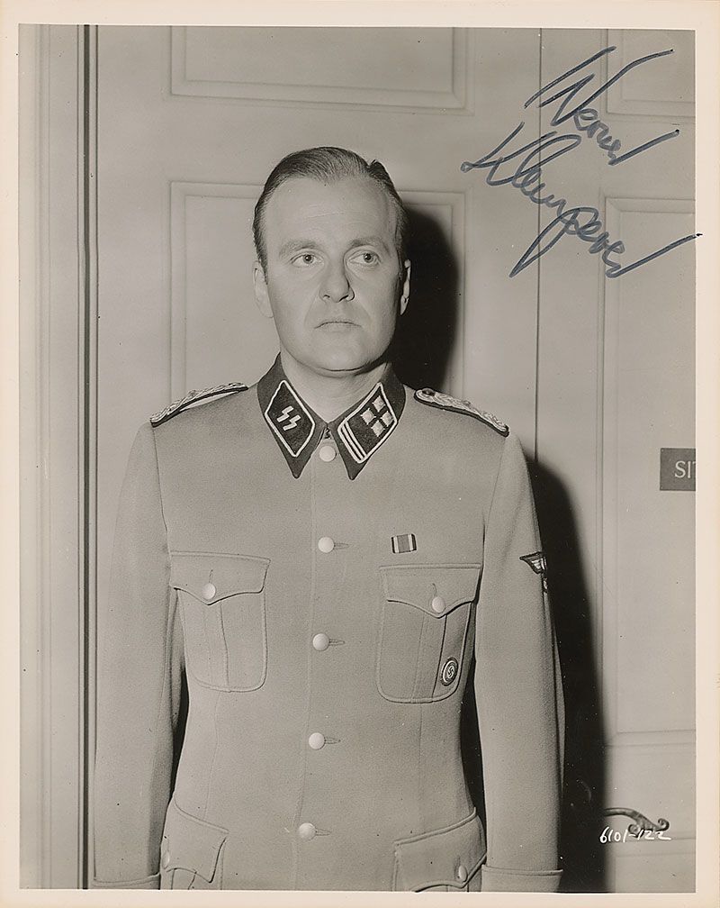 Glossy 8 x 10 publicity photo of Klemperer as Adolf Eichmann in the 1961 film Operation Eichmann, signed in black felt tip. In fine condition.