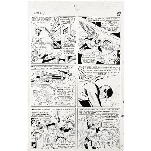 <B>Jack Kirby, Werner Roth, and Dick Ayers - X-Men #15, page 8 Original Art (Marvel, 1965).</B></I> The Beast, the Angel, and Iceman star in this page from a Marvel milestone featuring Dr. Trask and his creations, the Sentinels -- it's a mini-masterpiece from "Prisoners of the Master Mold." Jack Kirby's plot points are written in pencil on the page's borders. The image area of this page measures approximately 12.5" x 18.5", and the art is in Excellent condition.<BR><BR><b>Shipping:</b> Large Flat (<a target="_blank" href="http://www.heritageauctions.com/common/shipping.php">view shipping information</a>)