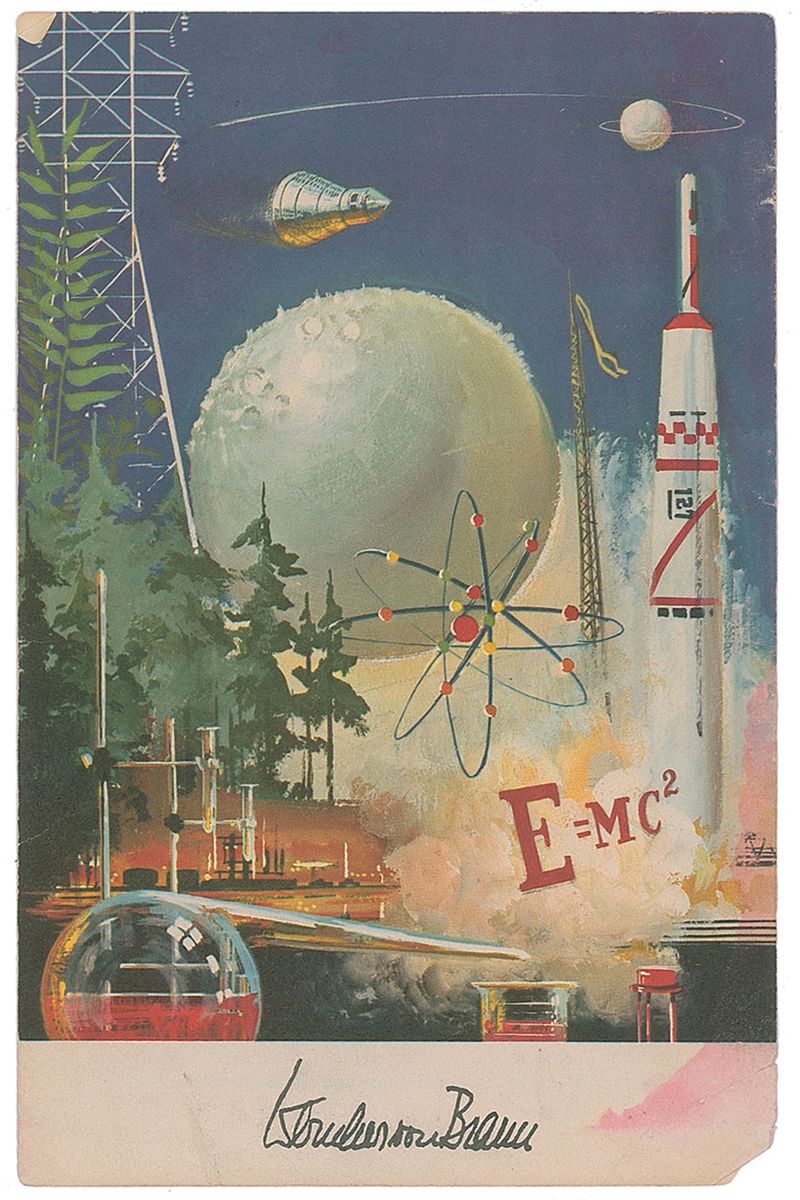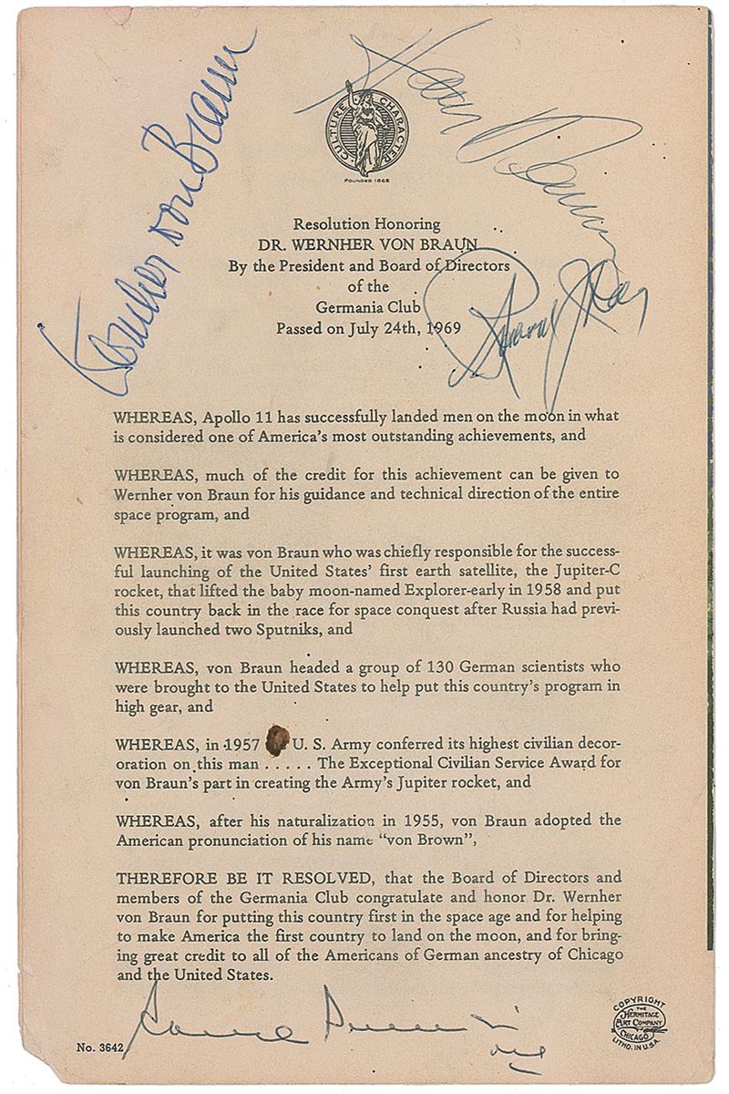Program from the Germania Club’s dinner honoring von Braun, 5.25 x 8.5, held in Chicago on October 28, 1969. Signed on the back cover in blue ballpoint by von Braun, and also signed by three other attendees. In very good condition, with some mild toning and edge wear to back cover, dampstaining to front cover, and expected handling wear.