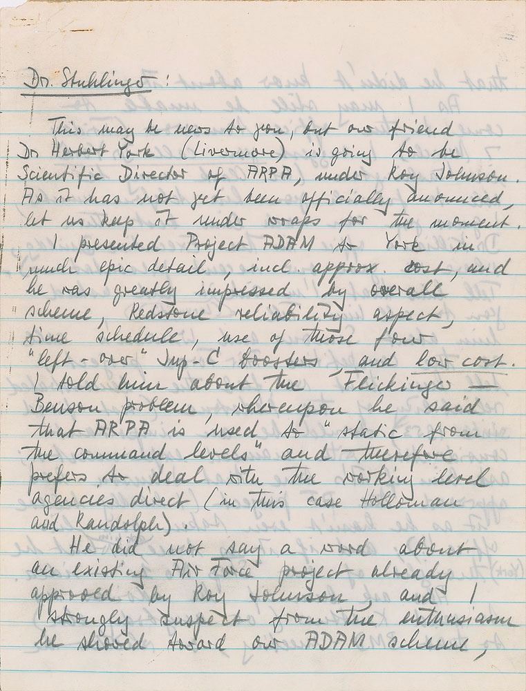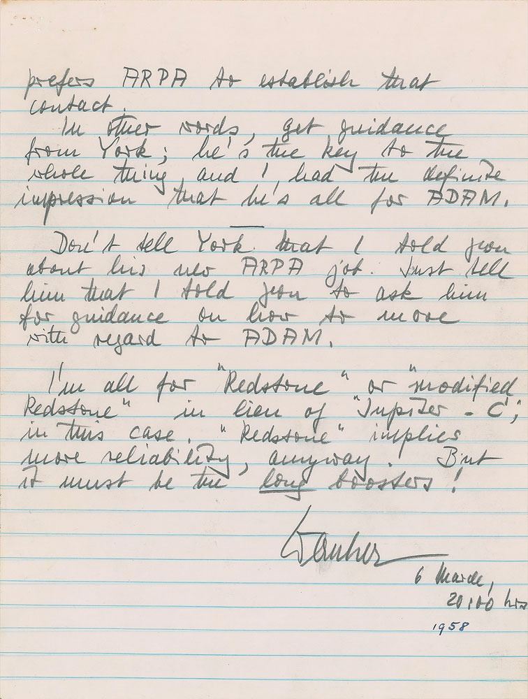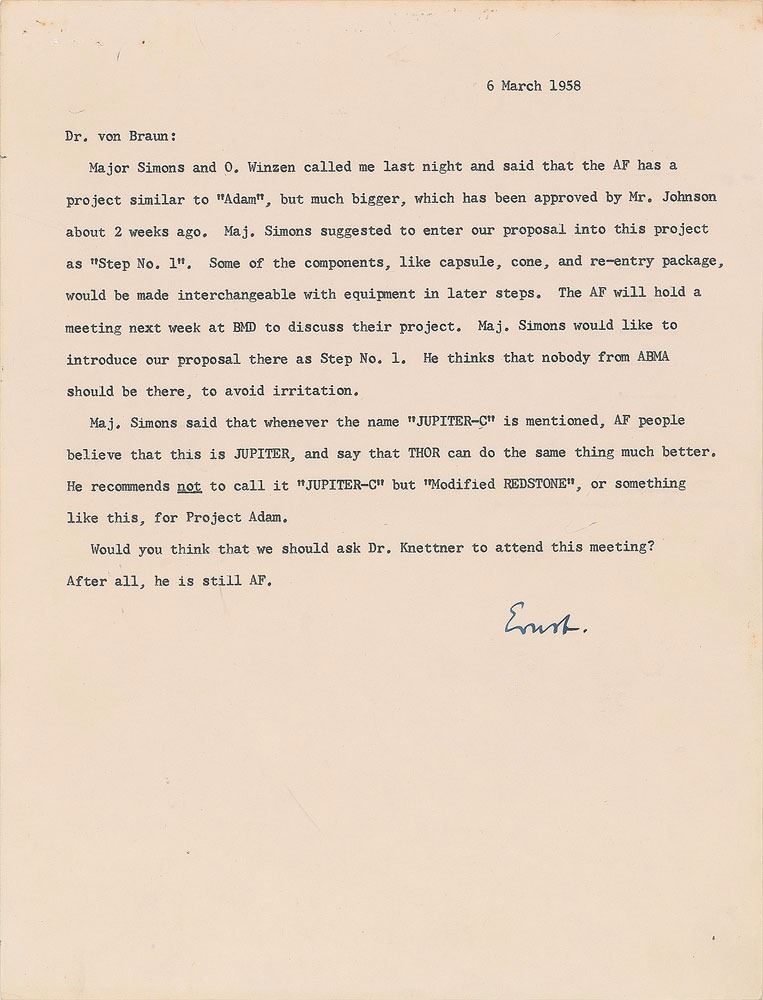 ALS in pencil, signed “Wernher,” three pages on two lined sheets, 8 x 10.5, March 6, 1958. Letter to fellow rocket scientist Ernst Stuhlinger, in part: "I presented Project Adam to York in such epic detail, incl. approx. cost, and he was greatly impressed by overall scheme, Redstone reliability aspect, time schedule, use of those few 'left-over' Jup-C boosters, and low cost…He did not say a word about an existing Air Force project already approved by Roy Johnson, and I strongly suspect from the enthusiasm he showed toward our Adam scheme, that he didn't know about it…I suggest you call Dr. York…Tell him about Simons and Winzer's call re competitive Air Force project; tell him that we feel the demonstrated reliability of the Redstone (test-fired since 1953) should be an important consideration with manned experiments; ask him if it's true that Johnson has approved the AF project (I hardly believe it as he hasn't even taken over his office!!); and if it is true, ask him what he (York) thought of our 'Step No. 1'—idea…In other words, get guidance from York; he's the key to the whole thing and I had the definite impression that he's all for Adam…I'm all for 'Redstone' or 'modified Redstone' in lieu of 'Jupiter-C' in this case. 'Redstone' implies more reliability, anyway. But it must be the long boosters!" Includes Stuhlinger's TLS to von Braun, signed "Ernst," one page, March 6, 1958, in part: "Major Simons and O. Winzen called me last night and said that the AF has a project similar to 'Adam,' but much bigger, which has been approved by Mr. Johnson about 2 weeks ago. Maj. Simons suggested to enter our proposal into this project as 'Step No. 1.' Some of the components, like capsule, cone, and re-entry package, would be made interchangeable with equipment in later steps…Maj. Simons said that whenever the name 'Jupiter-C' is mentioned, AF people believe that this is Jupiter, and say that Thor can do the same thing much better. He recommends not to call it 'Jupiter-C' but 'Modified Redstone,' or something like this, for Project Adam." In fine condition, with staples holes and rust marks to upper left corner.