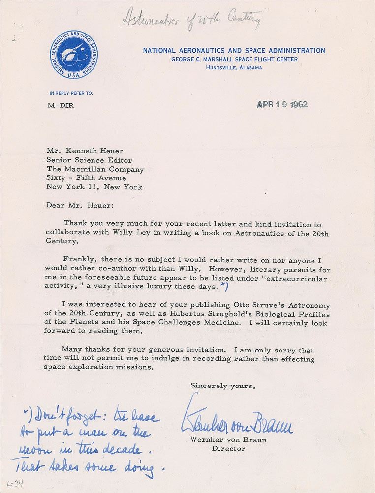 TLS, one page, 8 x 10.5, NASA letterhead, April 19, 1962. Letter to Kenneth Heuer, the senior Science editor at the Macmillan Company, in full: "Thank you very much for your recent letter and kind invitation to collaborate with Willy Ley in writing a book on Astronautics of the 20th Century. Frankly, there is no subject I would rather write on nor anyone I would rather co-author with than Willy. However, literary pursuits for me in the foreseeable future appear to be listed under 'extracurricular activity,' a very illusive luxury these days. I was interested to hear of your publishing Otto Struve's Astronomy of the 20th Century, as well as Hubertus Strughold's Biological Profiles of the Planets and his Space Challenges Medicine. I will certainly look forward to reading them. Many thanks for your generous invitation. I am only sorry that time will not permit me to indulge in recording rather than effecting space exploration missions." Von Braun adds a brief handwritten postscript: "Don't forget: We have to put a man on the moon in this decade. That takes some doing." In fine condition. President Kennedy's proposal of landing an American on the moon jump-started a space race in which the United States had already fallen behind. Almost exactly one year before von Braun wrote this letter, Cosmonaut Yuri Gagarin became the first human to reach outer space on April 12, 1961. The Americans were not far behind, however, as the advent of the Apollo program was marked by the unmanned flight of the Saturn I SA-1 on October 27, 1961. Preceded by the intrepid missions of the Mercury and Gemini programs, NASA's ultimate goal of landing and walking on the moon came to fruition on July 21, 1969, when the Apollo 11 Eagle touched down within the Sea of Tranquility.