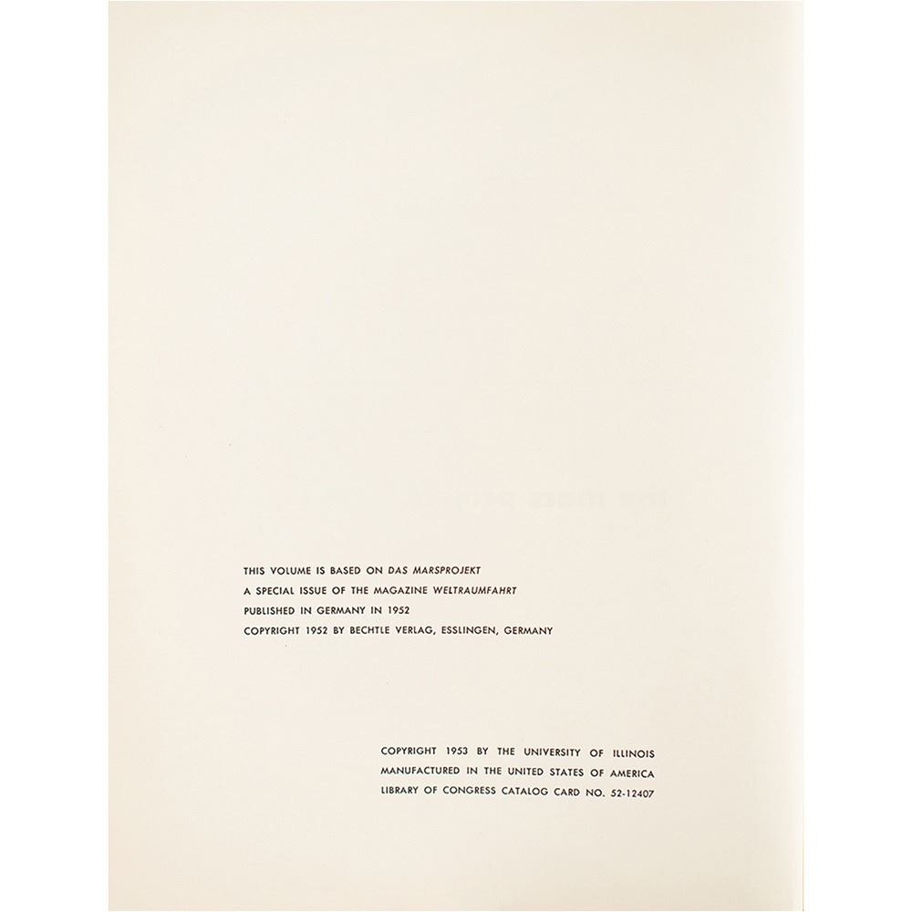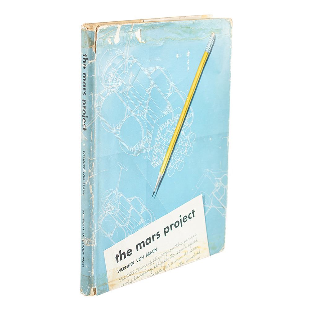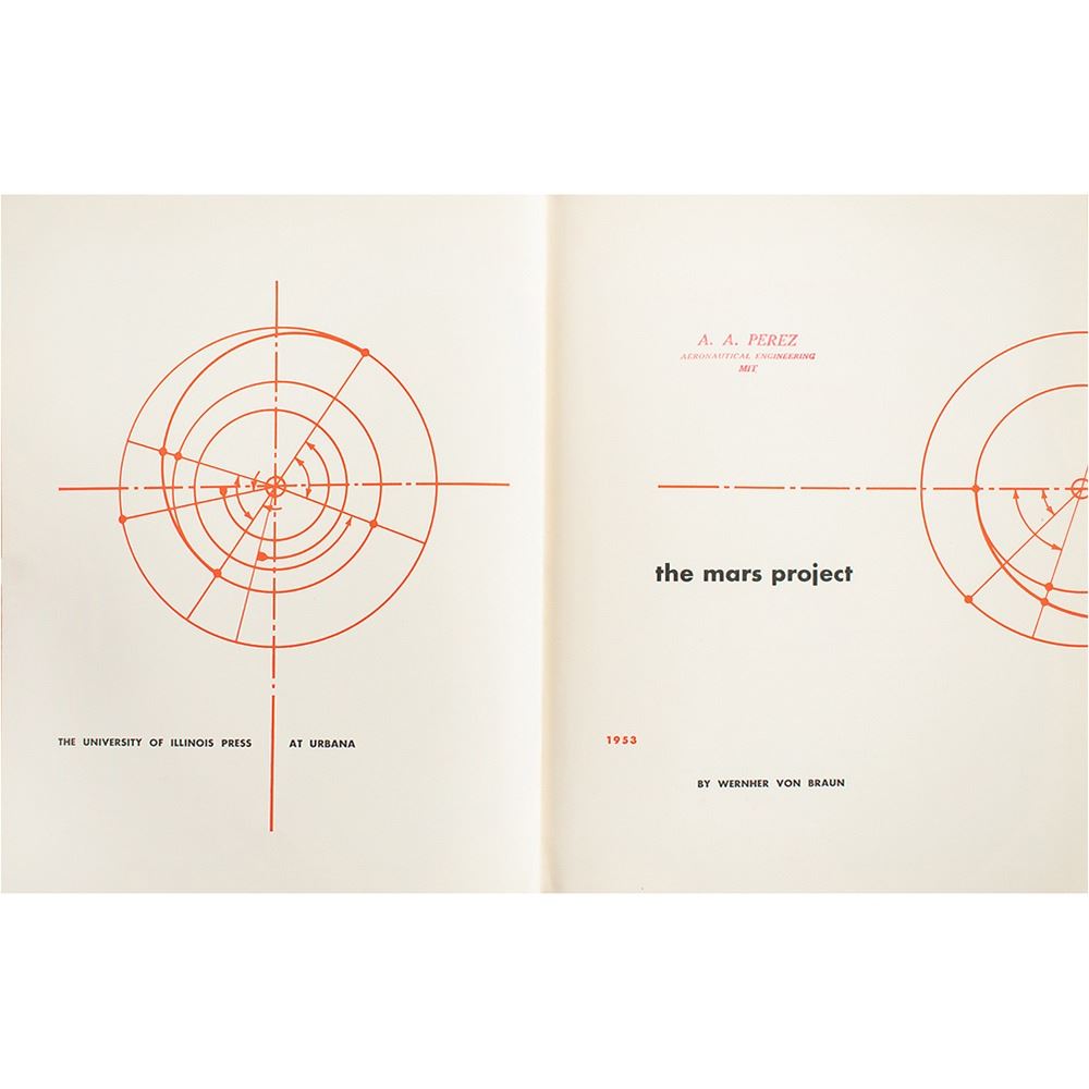 Scarce first edition of the 1953 book The Mars Project by Wernher von Braun. Published by the University of Illinois Press, in Urbana, Illinois. Hardcover with dust jacket, 7.25 x 9.25, 91 pages. The title page bears an ownership stamp belonging to A. A. Perez, ‰ÛÏAeronautical Engineering, MIT.‰Û Book condition: VG+/G with edgewear, creasing, surface losses, and toned tape and adhesive residue to the jacket.