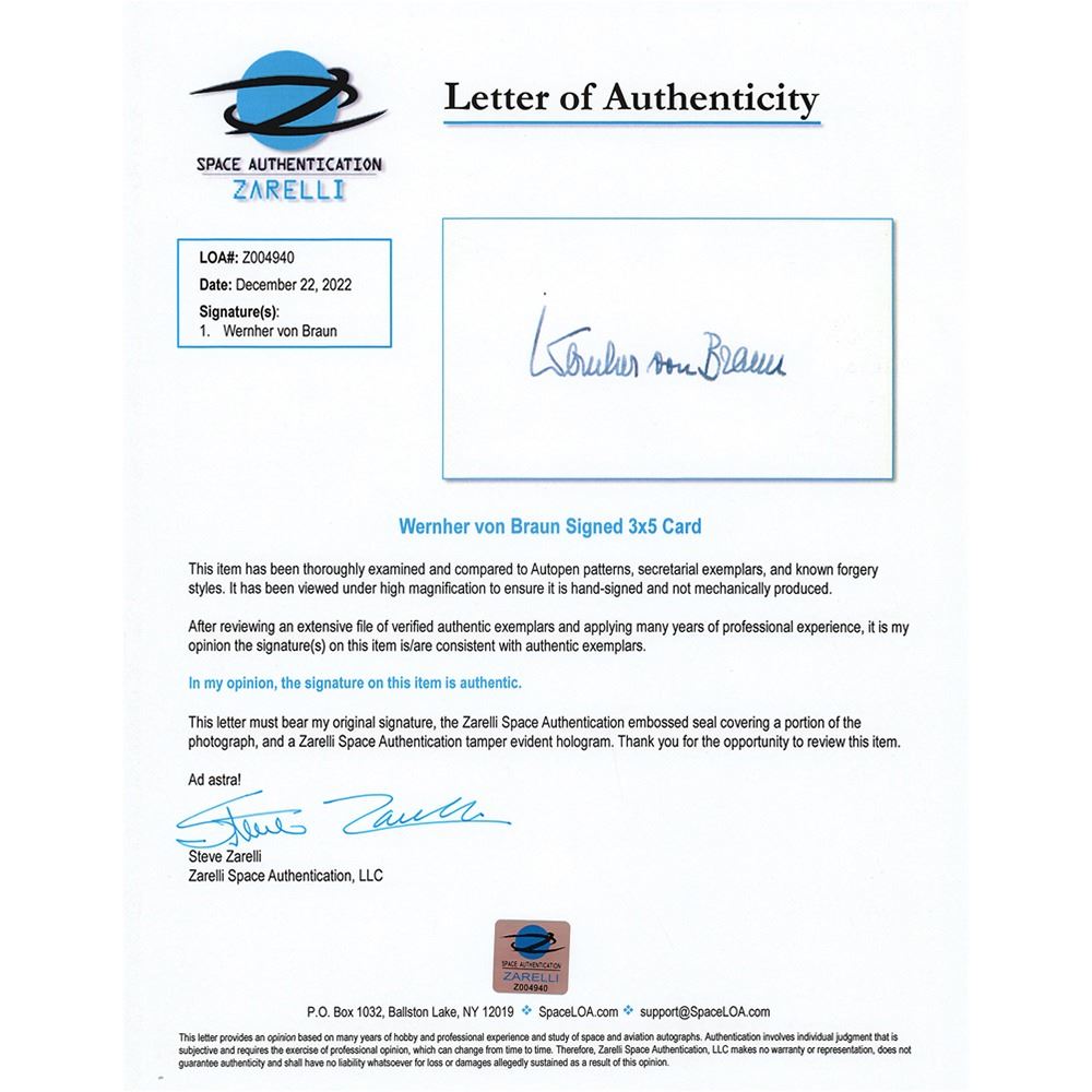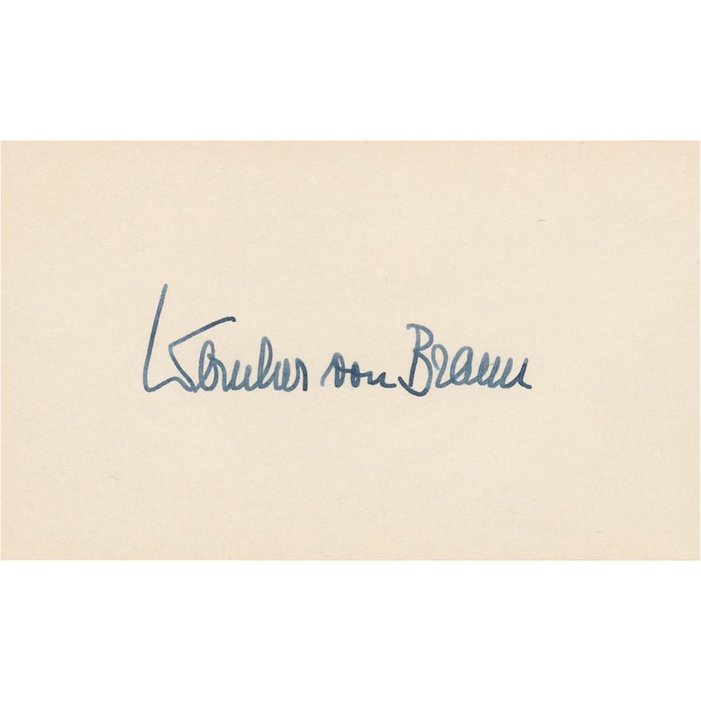 Well-centered ink signature, "Wernher von Braun,†on a 5 x 3 card. In very fine condition. Accompanied by a full letter of authenticity from Zarelli Space Authentication.