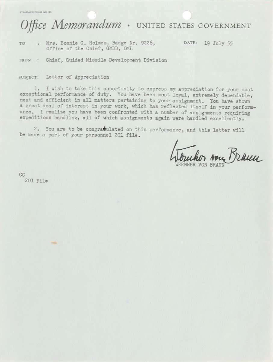 TLS, one page, 8 x 10.5, US Government Office Memorandum letterhead, July 19, 1955. Memo to Mrs. Bonnie G. Holmes, in part: “I wish to take this opportunity to express my appreciation for your most exceptional performance of duty. You have been most loyal, extremely dependable, neat and efficient in all matters pertaining to your assignment. You have shown a great deal of interest in your work, which has reflected itself in your performance…You are to be congratulated on this performance.” In fine condition.