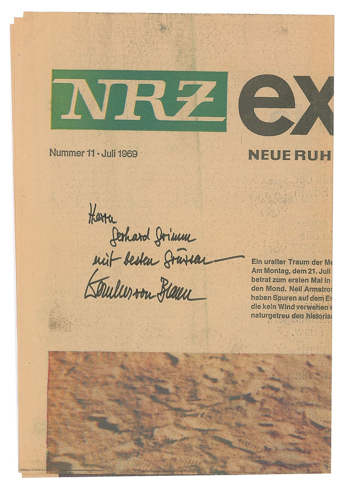 Insert from a copy of the German daily newspaper Neue Rheinische Zeitung (NRZ) from July 1969, No. 11, 14.25 x 20.75, with a large color image of the shadow of the Lunar Module Eagle on the bootprint-covered moon surface, signed and inscribed in German in black felt tip (translated), "Mr. Gerhard Grimm, with best regards, Wernher von Braun." In fine, folded condition. Accompanied by a full letter of authenticity from Zarelli Space Authentication.