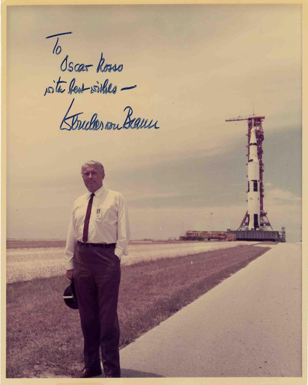 Signed photo of preeminent rocket scientist Wernher von Braun, standing in front of the Apollo 11. A naturalized U.S. resident who emigrated from Germany after WWII, von Braun has been called the greatest rocket scientist in history, and was one of the men largely responsible for the United State's post-war space dominance. Color photograph inscribed, ''To Oscar Rosso with best wishes - Wernher von Braun.'' 8'' x 10'' photo has stamp on verso (probably from NASA) identifying rocket. Slight yellowing to photo, otherwise fine.
