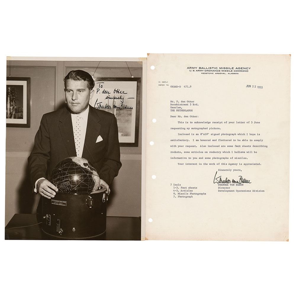 Two items: a TLS, one page, 8 x 10.5, Army Ballistic Missile Agency letterhead, June 13, 1959, addressed to Mr. P. den Otter, in part: "Inclosed is an 8è x 10è signed photograph which I hope is satisfactory. I am honored and flattered to be able to comply with your request"; and the referenced signed photo: glossy, 7.75 x 10.25, signed and inscribed in fountain pen, "To P. den Otter, sincerely‰ÛÓWernher von Braun." In overall very good to fine condition, with trimmed edges and scattered small surface impressions to the photo, and file holes to the left edge of the letter.