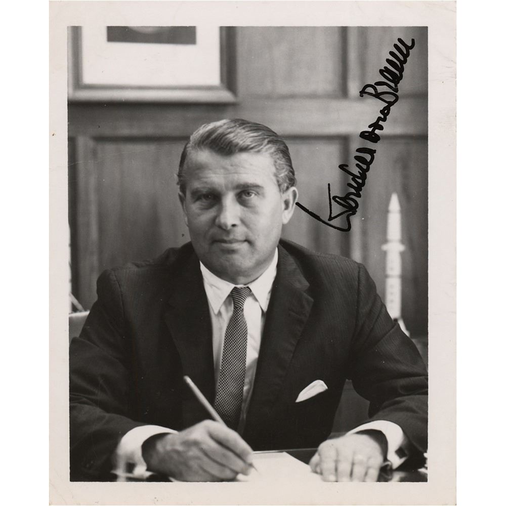 Vintage glossy 4 x 5 photo of Wernher von Braun seated at his desk, signed in bold black ink. In very good condition, with a horizontal crease passing through the top of von Braun's head, and the first letter of his last name. Accompanied by a full letter of authenticity from Zarelli Space Authentication.