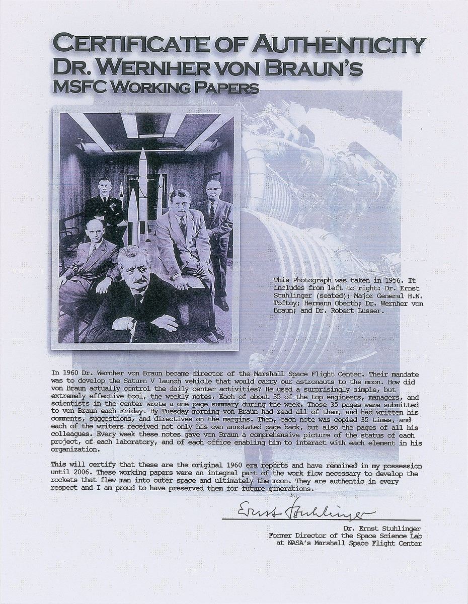 Typed report notes by Ernst Stuhlinger, one page, 8 x 10.5, circa early 1960s, annotated in pencil by Von Braun and initialed, “B.” The notes concern the “Electric Propulsion Program,” the 1963 budget, and the “possibilities and implications of a Saturn C-1 three stage vehicle project for lunar exploration and technology.” Annotated at the bottom by Von Braun, “Ernst St. That’s what I expected, JPL will get it! B.” In fine condition, with paperclip impressions to right edge. Accompanied by a certificate of authenticity signed by Stuhlinger, who was the director of the Marshall Space Flight Center’s Space Science Lab. From the collection of aerospace memorabilia specialist Ken Havekotte.