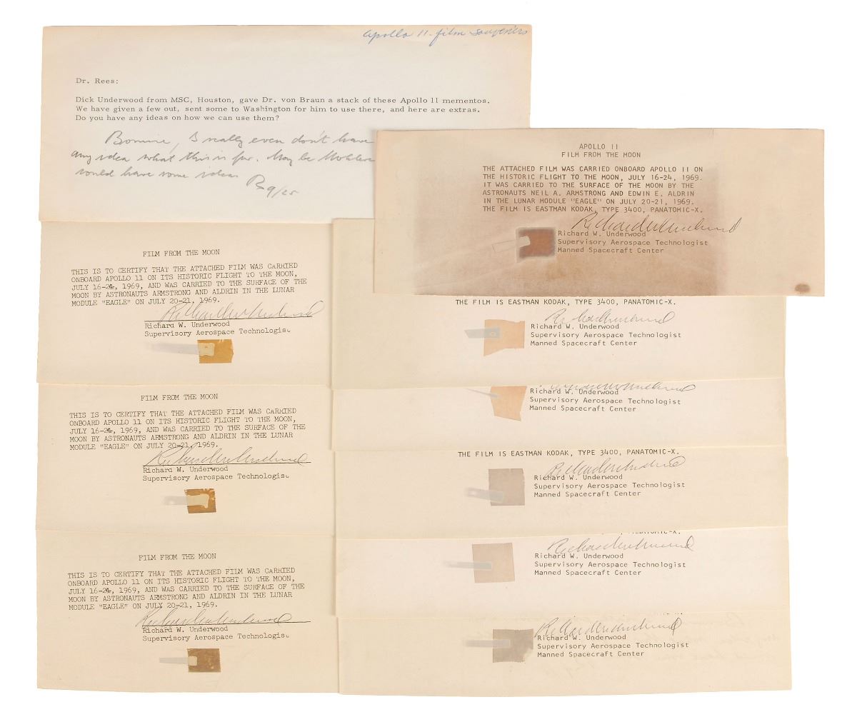 Collection of nine flown photographic film fragments carried on the Apollo 11 mission, each thin slice measuring approximately .75? long, all affixed to explanatory sheets signed by Supervisory Aerospace Technologist Richard W. Underwood. Underwood’s presentation certificates indicate that the film “was carried to the surface of the moon by astronauts Neil A. Armstrong and Edwin E. Aldrin in the Lunar Module ‘Eagle’ on July 20–21, 1969. The film is Eastman Kodak Type 3400, Panatomic-X.” Includes the original envelope that contained these sheets with a typed memo to “Dr. Rees” by Wernher von Braun’s longtime assistant Bonnie Holmes, “Dick Underwood from MSC, Houston, gave Dr. von Braun a stack of these Apollo 11 mementos. We have given a few out, sent some to Washington for him to use there, and here are extras.” In overall fine condition, with an irregular block of toning to one sheet. These Apollo 11 mementos were given to von Braun and when he left the Marshall Spaceflight Center in February 1970, his successor handed them off to Bonnie Holmes.