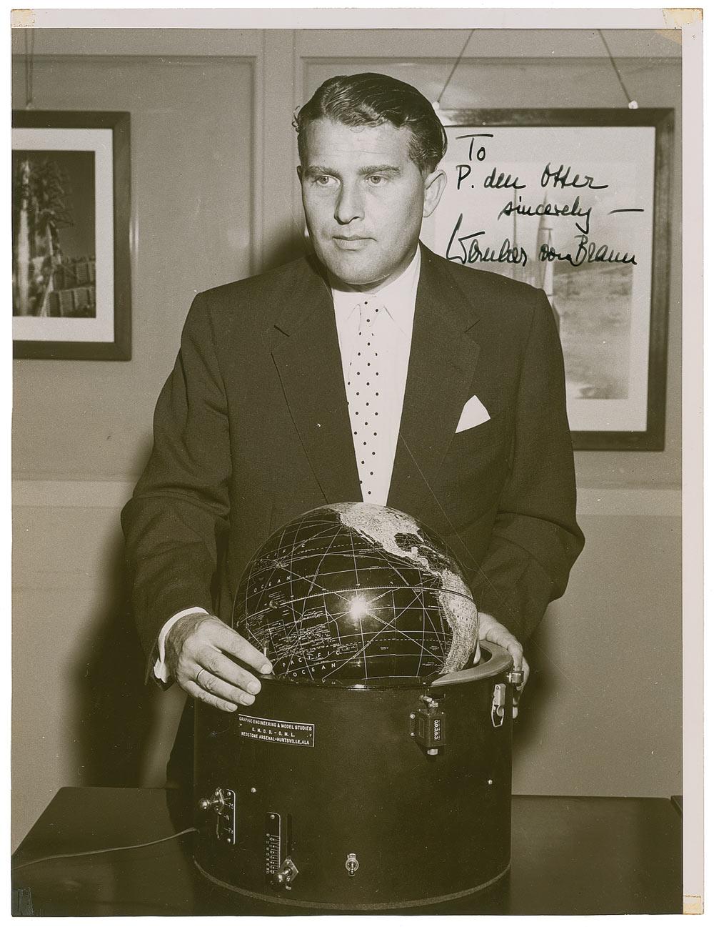 German rocket scientist (1912–1977) who emigrated to the United States following World War II and assumed an instrumental role in the development of the American space program. Two items: TLS, signed “Wernher von Braun,” one page, 8 x 10.5, stamp-dated June 13, 1959, on Army Ballistic Missile Agency letterhead. Von Braun responds to an autograph request. In part: “Inclosed [sic] is an 8 x 10 signed photograph which I hope is satisfactory. I am honored and flattered to be able to comply with your request. Also inclosed [sic] are some fact sheets describing rockets, some articles on rocketry which I believe will be informative to you and some photographs of missiles. Your interest in the work of this Agency is appreciated.”; and a glossy 7.75 x 10.25 photo, signed and inscribed in fountain pen, “To P. den Otter, sincerely—Wernher von Braun.” Some light bends, creases, tiny indentations, and trimming to photo, and light wrinkling, staining at the tips, and five filing punch holes at the left side of the letter, otherwise fine condition. Two fabulous mementos from the very start of the American space program.