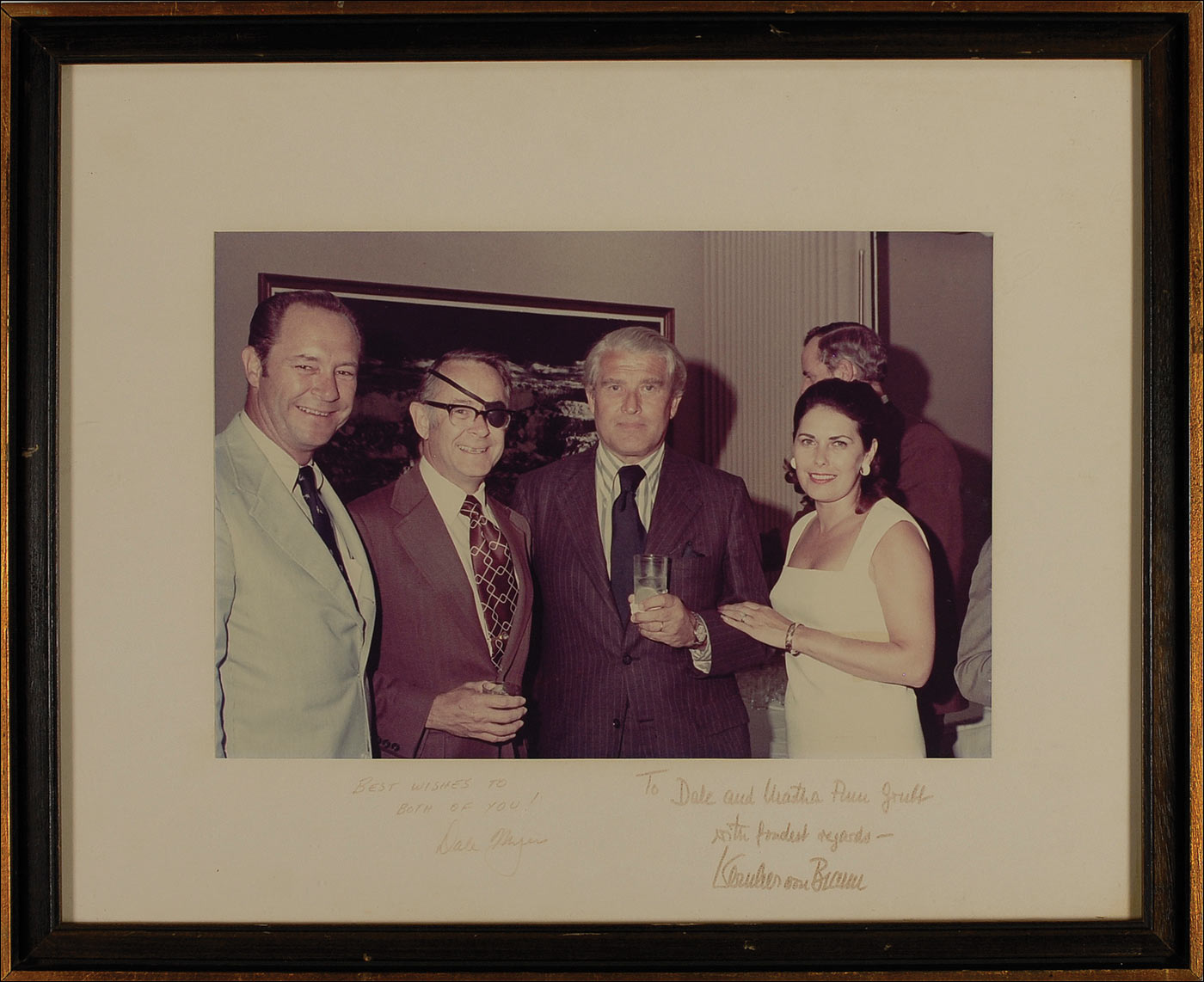 Color 14 x 9.5 photo of von Braun, Dale Meyers, and a couple at a cocktail party affixed to a 19.5 x 15.5 mount, signed and inscribed in black felt tip on the mount, “To Dale and Martha Ann Grubb, with fondest regards—Wernher von Braun,” and “Best wishes to both of you! Dale Meyers.” Framed to an overall size of 21.75 x 17.5. Some fading and irregular adhesion to both signatures and inscriptions, but still completely legible, otherwise fine condition. Meyers was president and chief operating officer of Jacobs Engineering Group, Inc. and a NASA associate administrator with responsibility for the Apollo, Skylab, and Shuttle programs.