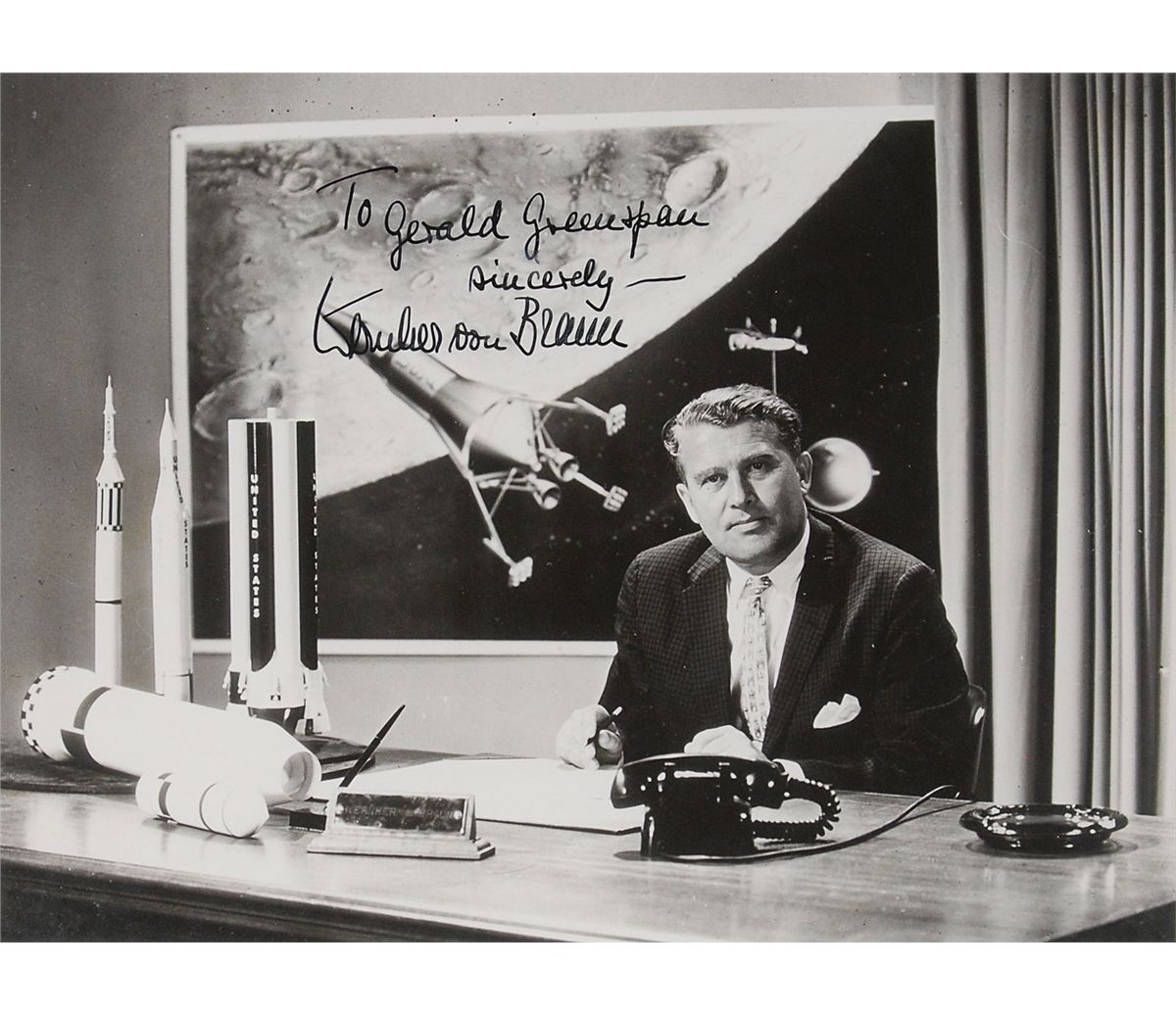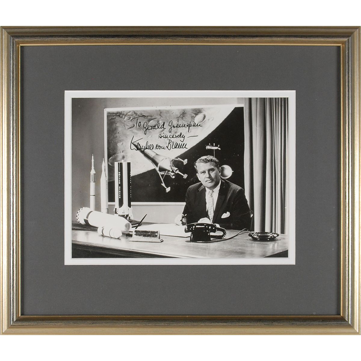 Stellar matte-finish 9.5 x 7.25 photo of Von Braun seated at his desk at Marshall Space Flight Center in 1960, signed and inscribed in fountain pen, “To Gerald Greenspan, sincerely—Wernher von Braun.” Attractively double-matted and framed to an overall size of 16 x 14. In fine condition, with a few surface creases. An especially appealing portrait of the influential rocket scientist in his element, with several models displayed on his desk and an image of an approach to the moon in the background.