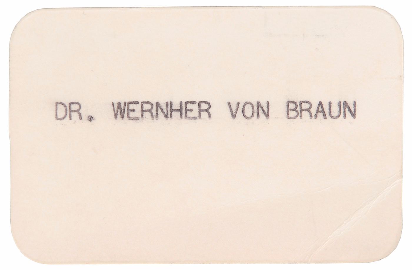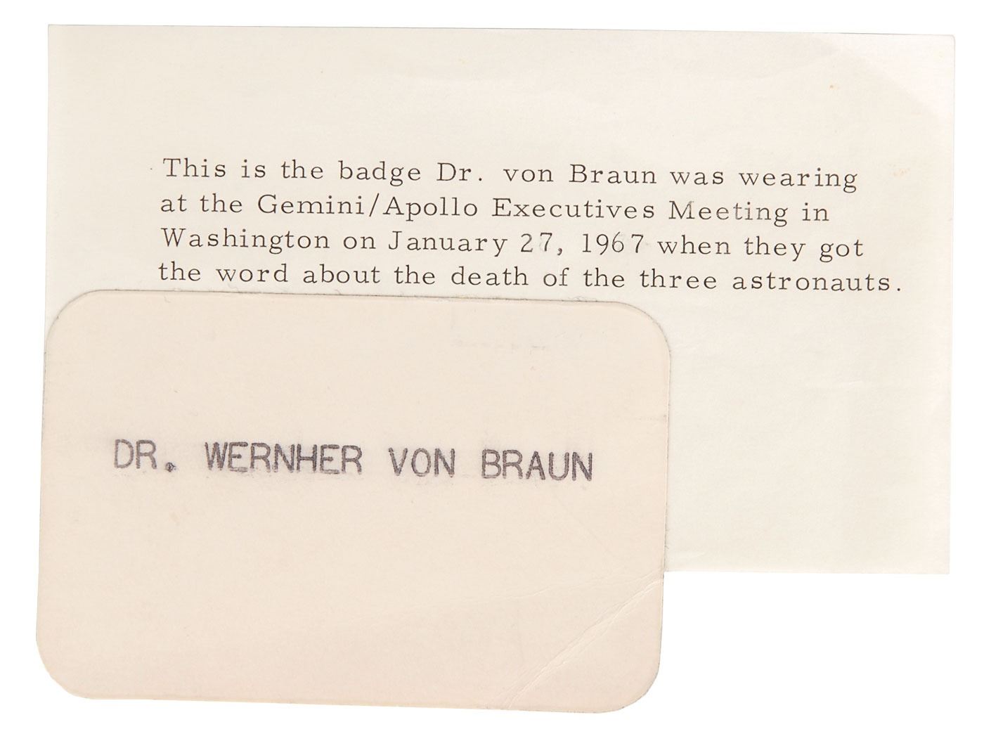 Wernher von Braun's name badge, 3.5 x 2.25, simply reading "Dr. Wernher von Braun," affixed to a caption typed by von Braun's longtime assistant Bonnie Holmes, "This is the badge Dr. von Braun was wearing at the Gemini/Apollo Executive Meeting in Washington on January 27, 1967 when they got the word about the death of the three astronauts." In very good to fine condition, with a crease to the lower right corner.