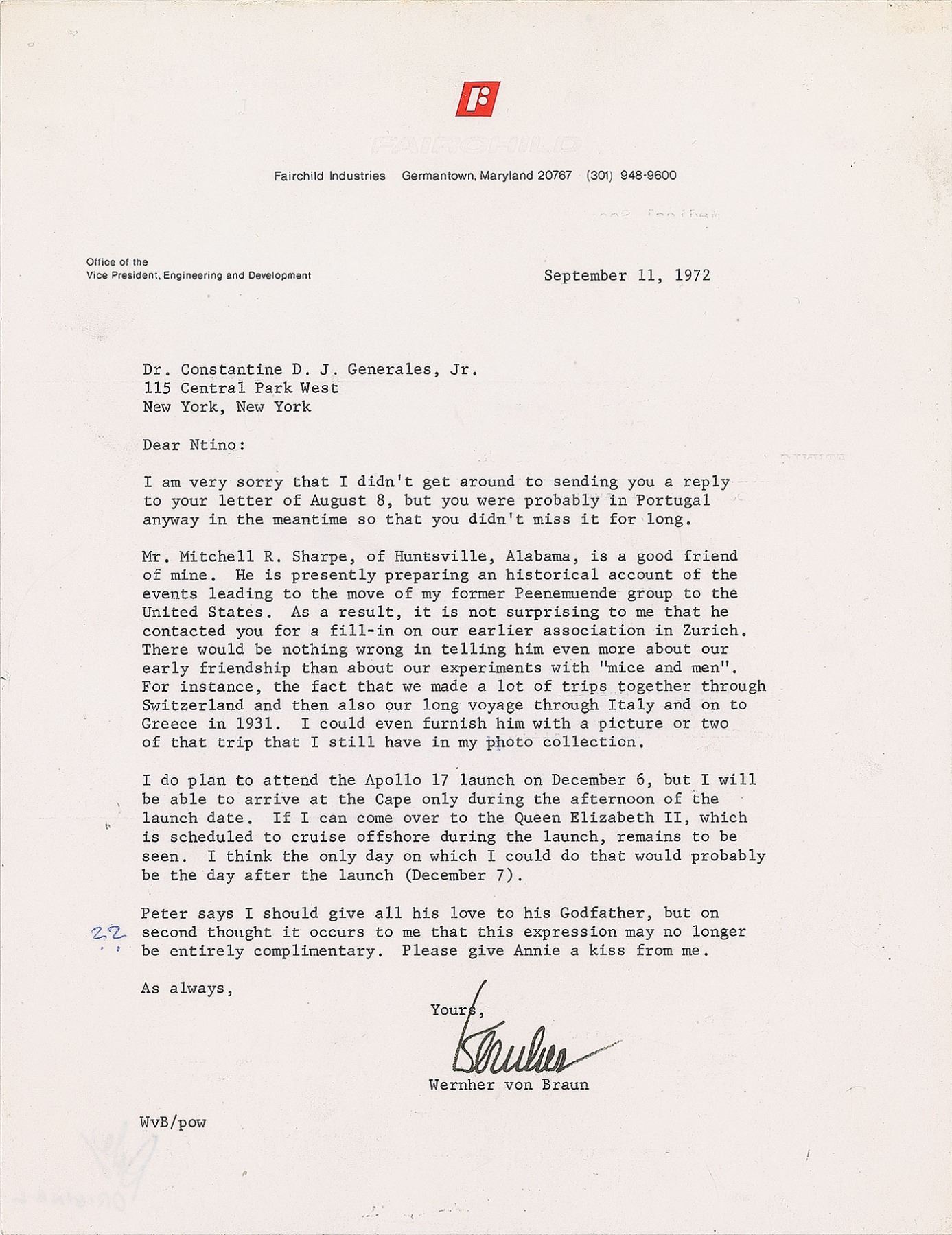 TLS signed “Wernher,” one page, 8.5 x 11, Fairchild Industries letterhead, September 11, 1972. Letter to Constantine D. J. Generales, Jr., in part: "Mr. Mitchell R. Sharpe, of Huntsville, Alabama, is a good friend of mine. He is presently preparing an historical account of the events leading to the move of my former Peenemuende group to the United States. As a result, it is not surprising to me that he contacted you for a fill-in on our earlier association in Zurich. There would be nothing wrong in telling him even more about our early friendship than about our experiments with 'mice and men.' For instance, the fact that we made a lot of trips together through Switzerland and then also our long voyage through Italy and on to Greece in 1931. I could even furnish him with a picture or two of that trip that I still have in my photo collection. I do plan to attend the Apollo 17 launch on December 6, but I will be able to arrive at the Cape only during the afternoon of the launch date. If I can come over to the Queen Elizabeth II, which is scheduled to cruise offshore during the launch, remains to be seen. I think the only day on which I could do that would probably be the day after the launch (December 7). Peter says I should give all his love to his Godfather, but on second thought it occurs to me that this expression may no longer be entirely complimentary. Please give Annie a kiss from me." In fine condition, with staple holes to the upper left corner. Accompanied by two copies of ALSs from Generales addressed to von Braun, dated October 18, 1972, and April 17, 1974; the earlier letter, in part: "By the way, the Queen Elizabeth II is not scheduled to make the Apollo shot. Somehow, I will manage to go down to see the launch and will probably run into you there. That you have withdrawn from NASA, things won't be the same."
