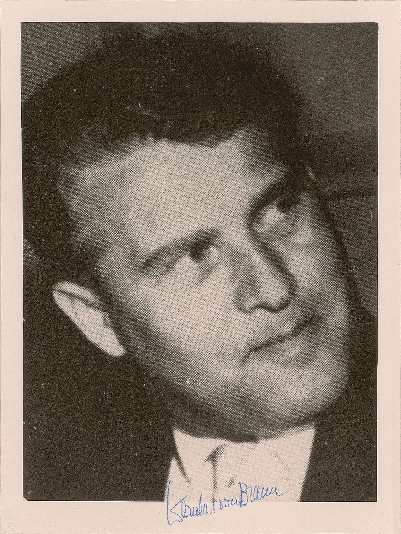Uncommon semi-glossy 7 x 9.5 double-weight photo of Wernher von Braun in a close-up pose, signed below in blue ballpoint. In fine condition, with rather grainy image quality.
