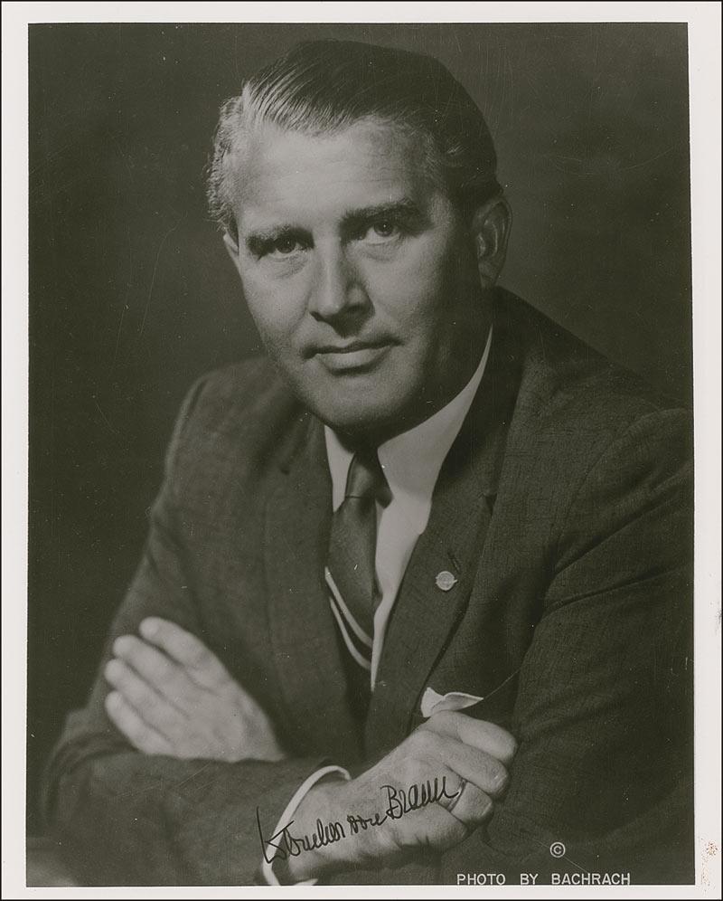 Glossy 8 x 10 Bachrach portait, signed in black felt tip. In fine condition, with scattered creasing and an area of soiling at the extreme lower right border.
