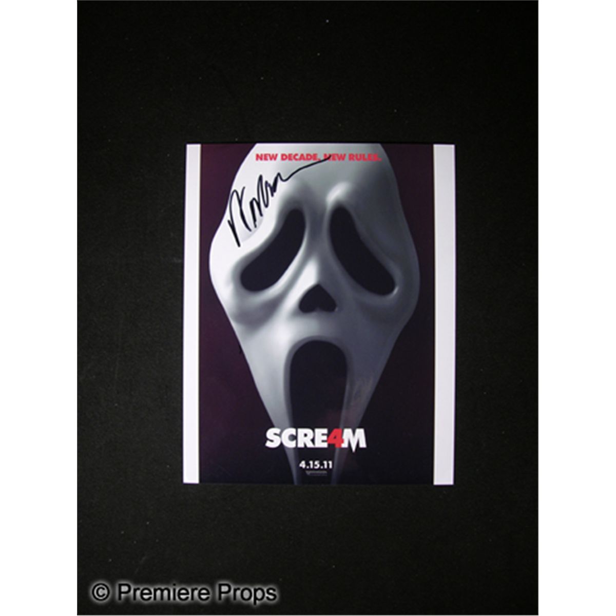 8 x 10 color photo advertising Scream 4, signed in black felt pen by director Wes Craven. Signed at the ArcLight in Hollywood. Rare signature.
