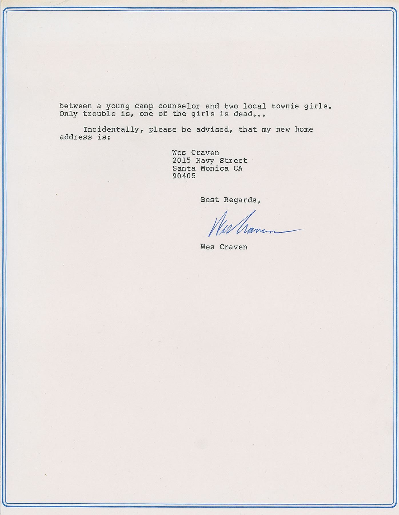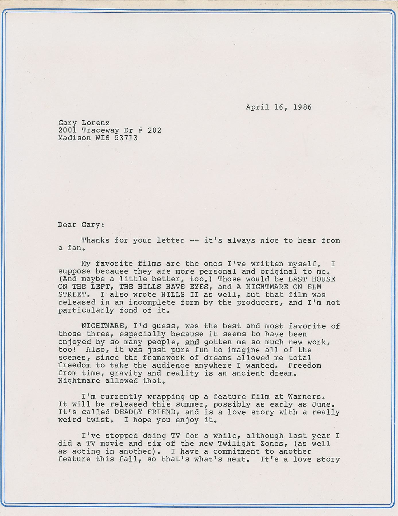 TLS, two pages, 8.5 x 11, April 16, 1986. Letter to Gary Lorenz, in part: “My favorite films are the ones I’ve written myself. I suppose because they are more personal and original to me. (And maybe a little better, too.) Those would be Last House on the Left, The Hills Have Eyes, and A Nightmare on Elm Street. I also wrote Hills II as well, but that film was released in an incomplete form by the producers, and I’m not particularly fond of it. Nightmare, I guess, was the best and most favorite of those three, especially because it seems to have been enjoyed by so many people, and gotten me so much new work, too! Also, it was just pure fun to imagine all of the scenes, since the framework of dreams allowed me total freedom to take the audience anywhere I wanted. Freedom from time, gravity and reality is an ancient dream. Nightmare allowed that.” In fine condition, with trivial wear to top edge.