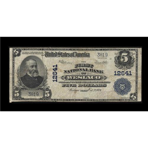 <B>Weslaco, TX</B></I> - $5 1902 Plain Back Fr. 609 <B>The First NB </B></I> Ch. # 12641<BR>This is an attractive <B>Fine</B></I> that has a few wallet stains. The signatures are light, but clear. Only 11 Large notes are reported in Kelly, with this being one of them. A tiny amount of $720 LSO was reported in 1935.