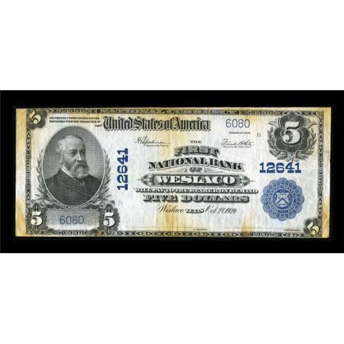 <B>Weslaco, TX</B></I> - $5 1902 Plain Back Fr. 609 <B>The First NB</B></I> Ch. # 12641<BR> With a tiny amount of $720 LSO reported in 1935, finding large size examples from here can prove daunting. This <B>Fine </B></I>note does display some stains.<BR><BR><b>Shipping:</b> Coins & Currency (<a target="_blank" href="http://www.heritageauctions.com/common/shipping.php">view shipping information</a>)