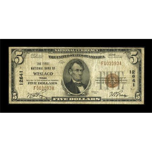 <B>Weslaco, TX</B></I> - $5 1929 Ty. 1 <B>The First NB</B></I> Ch. # 12641<BR> Just six small to report for this Hidalgo County issuer. H.B. Seay signs as cashier and W.S. Ray as president.<B> Fine.</B></I><BR><BR><b>Shipping:</b> Coins & Currency (<a target="_blank" href="http://www.heritageauctions.com/common/shipping.php">view shipping information</a>)