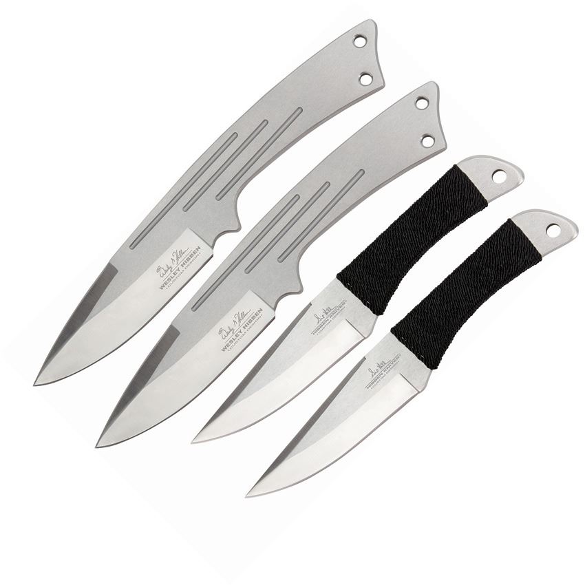 Four pieces. As seen in The Expendables 3 movie. Each knife has one-piece stainless construction with sharpened edge and piercing point. Two 8 5/8" throwers feature cord-wrapped handles with lanyard hole. Two 10 1/8" throwers have uncovered, ergonomically machined handles with dual lanyard holes. Blades feature autographed laser etchings. Black nylon sheath holds all four.