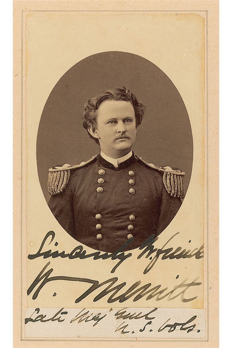 A Union contemporary of Custer's in the Civil War and a rival for the laurels of boldest young cavalier, by 1876 Merritt was Colonel of the 5th Cavalry and was in command at War Bonnet Creek and after the Battle of the Rosebud and Little Bighorn Battle, Merritt joined Brigadier General George Crook and commanded Crook's cavalry brigade for the rest of the Great Sioux War. Vintage 2 x 3.5 photo of Merritt in uniform, signed in black ink, “Sincerely yr. friend, W. Merritt.” Image is affixed to a 2.25 x 4 lightweight mount, with a slip affixed to the bottom with “Late Maj. Genl, U.S. Vols,” in another hand. In fine condition, with a bit of scattered trivial soiling.