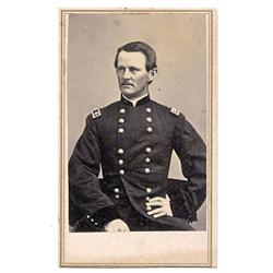 Commanded a brigade of Volunteers at Gettysburg. Post-war activities included service against the Indians in the West. In the Spanish-American War he led the invasion of Manila. Waist-up seated, with his fingers spread around his button, by Anthony/Brady. [3+]