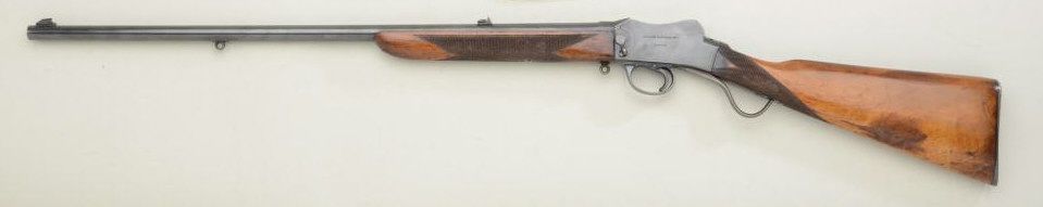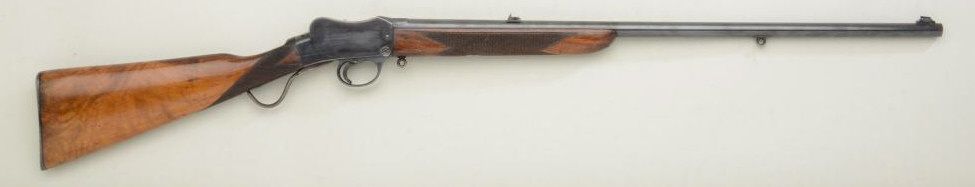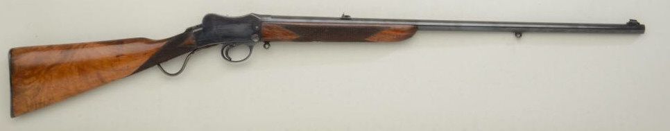 Wesley Richards Falling block single shot rook-rifle on Martini Henry type action in 2.97 x 2.50 cal., blue finish, checkered walnut stock, serial #8584. The gun shows a 25" round barrel, 3-leaf folding rear sight,finger latch detachable barrel for takedown; approximately 90-95% original blue finish remains. The stocks are good with some mars to the checkering, normal wear and aging, about 75% blue on the butt plate. The leverrelease shows 30-50% case hardening. The action good, bore good to very good. The left side of the frame shows Wesley Richards & Co., London and also marked on the barrel with detachable barrel marking. A very nicelittle gun by a well recognized London maker. Est.: $750-$1,500