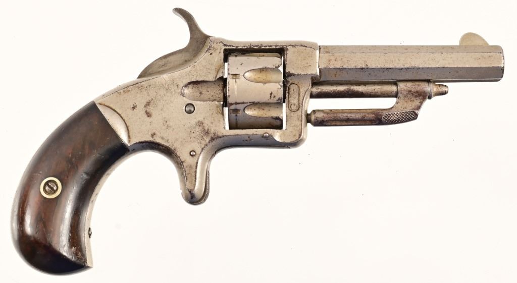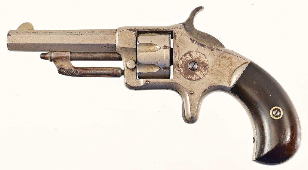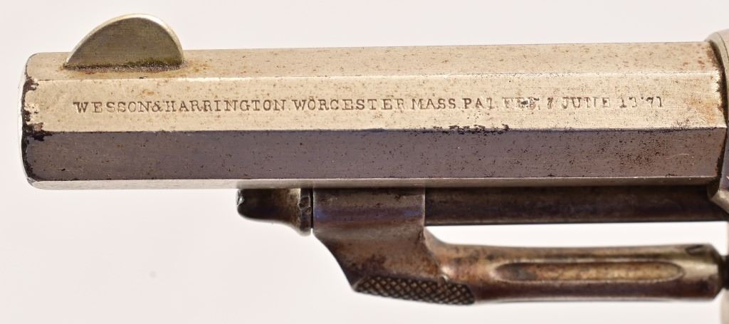 Manufactured from 1874 to 1879. Has 2.5" octagon barrel with the Wesson & Harrington address and patent dates. Cylinder is numbered to the gun. Figured bird head grips. Action works well. S/N 7317, antique.