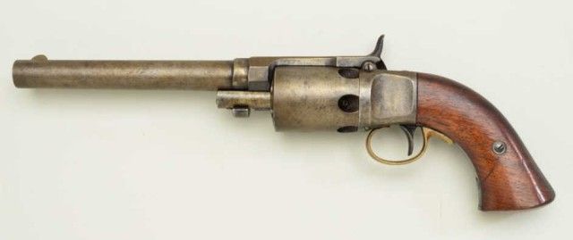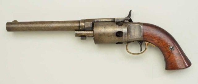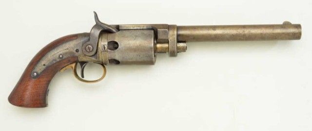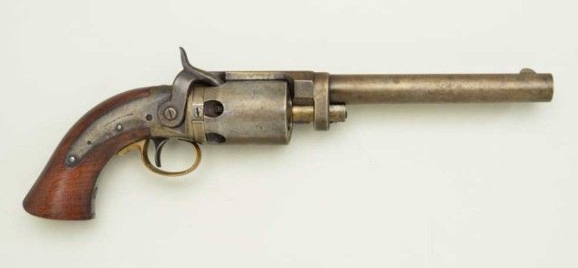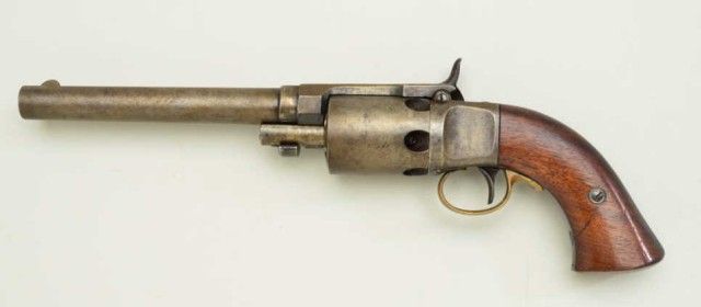 Wesson & Leavitt patent Dragoon by Mass. Arms Co. 40 cal, 6 shot cyl, 7-1/8” barrel, 15” overall, serial #182. The revolver remains in good original condition showing faint traces of original colors mixed in with aneven patina with some minor erosion and pinprick pitting. The grips are very good plus with at least 80% varnish and minor scratches with some minimal wear at edges. The markings are good and sharp, the actiontight, the bore bright. One of approx 800 produced a decade before the Civil War. Refer Flayderman 7A -055. From an old N.Y collector’s estate. Est.;$1,750-$3,500.