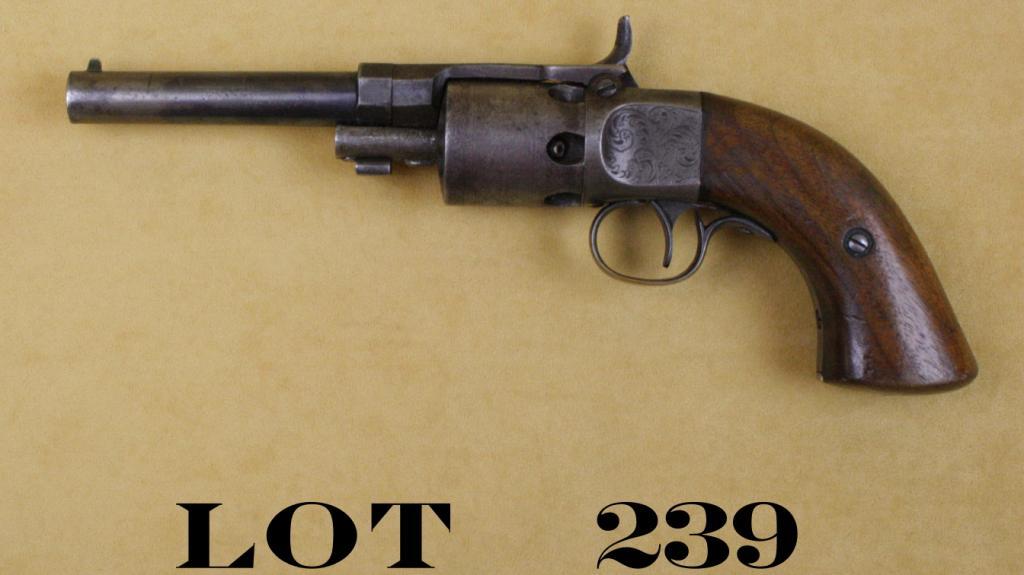 Wesson & Levitt by Mass Arms percussion revolver, .31 cal., 4” round barrel, blue finish, wood grips, #289. This gun is in overall good to very good condition showing approx. 50% original blue on the barrel,brown patina on the engraved frame and etched cylinder, approx. 60% original silver finish on brass trigger guard and back strap, good bore, action and markings; majority of etched cylinder coverage remaining; good grips with wear to the finish and several scattered mars from carry and storage. Est.: $750-$1,500.