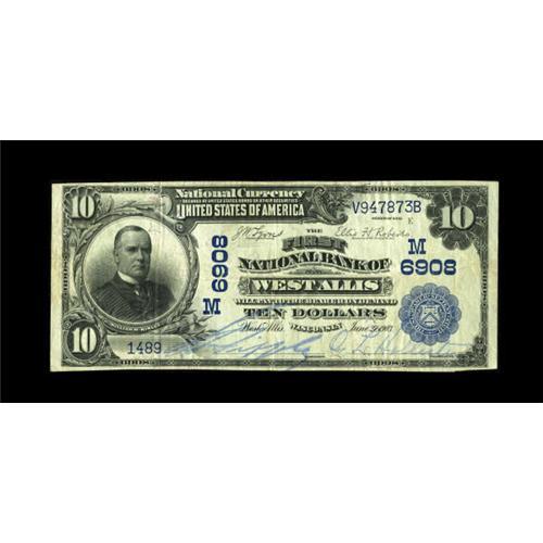 <B>West Allis, WI</B></I> - $10 1902 Plain Back Fr. 624 <B>The First NB</B></I> Ch. # (M)6908<BR> This bright representative is a pleasing note on a popular Milwaukee suburb. The attractive blue signatures were rubber stamped. <B>Very Fine.</B></I><BR><BR><b>Shipping:</b> Coins & Currency (<a target="_blank" href="http://www.heritageauctions.com/common/shipping.php">view shipping information</a>)