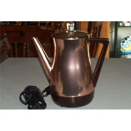 This is a wonderful copper plated West Bend, Electric Perculator. Also, still makes a great pot of coffee. Cord in execellent condition also. The WEST BEND embossed just under the tip of the handle. Hard plastic handle. Glass knob on top. Bottom states: WEST BEND FLAVO MATIC - DO NOT EMMERSE IN WATER - 450 Watts - 110-120 Volts; Start with cold water-CSA APP. NO. 2486; Pat. 3269E - A product of WEST BEND Aluminum Co., Westbemd, Wisconsin, USA. Measures: 8 3/4 inches tall; The glass knob adds an additional 1 1/4 inches tall. Excellent+ Condition.
