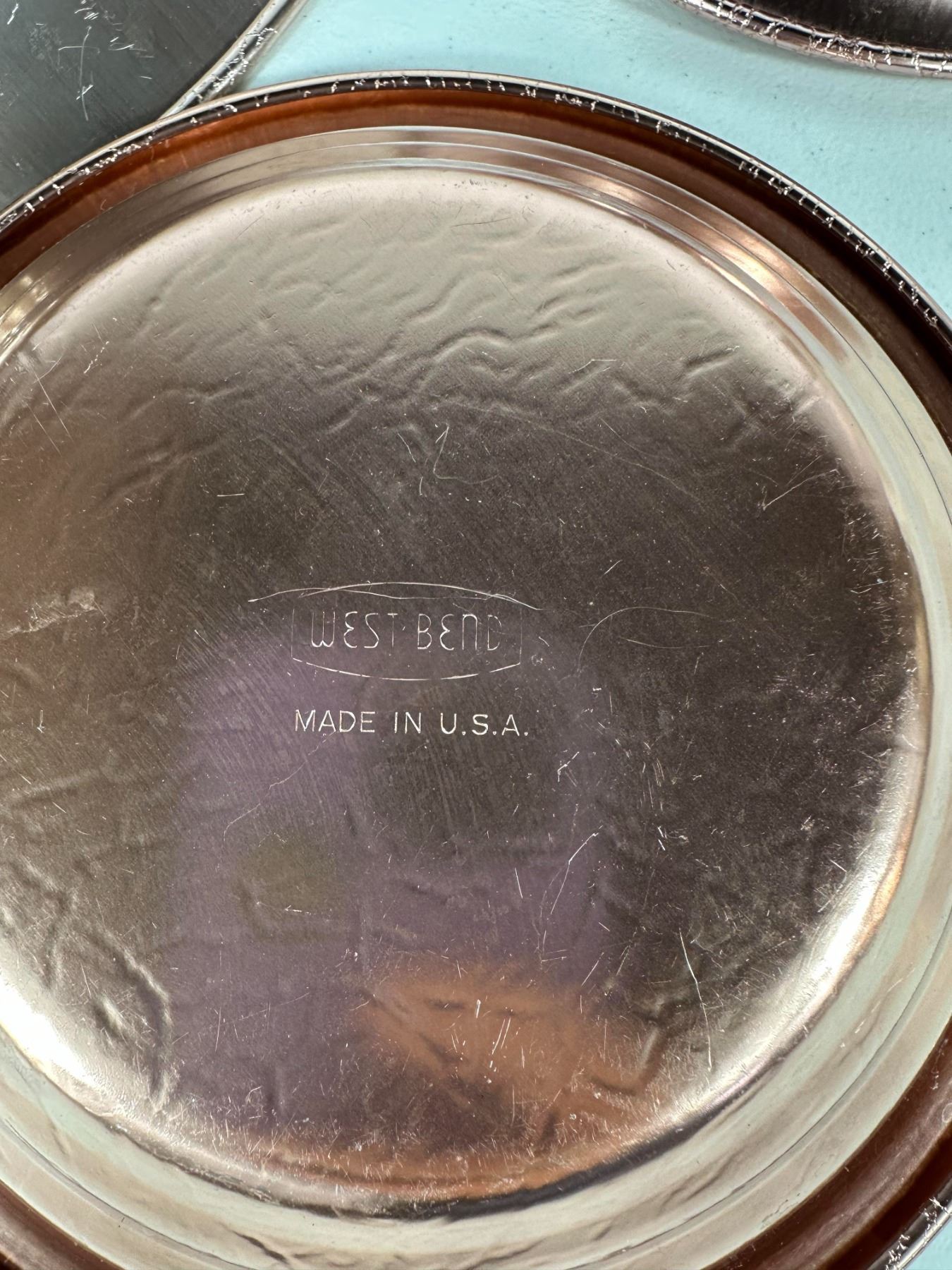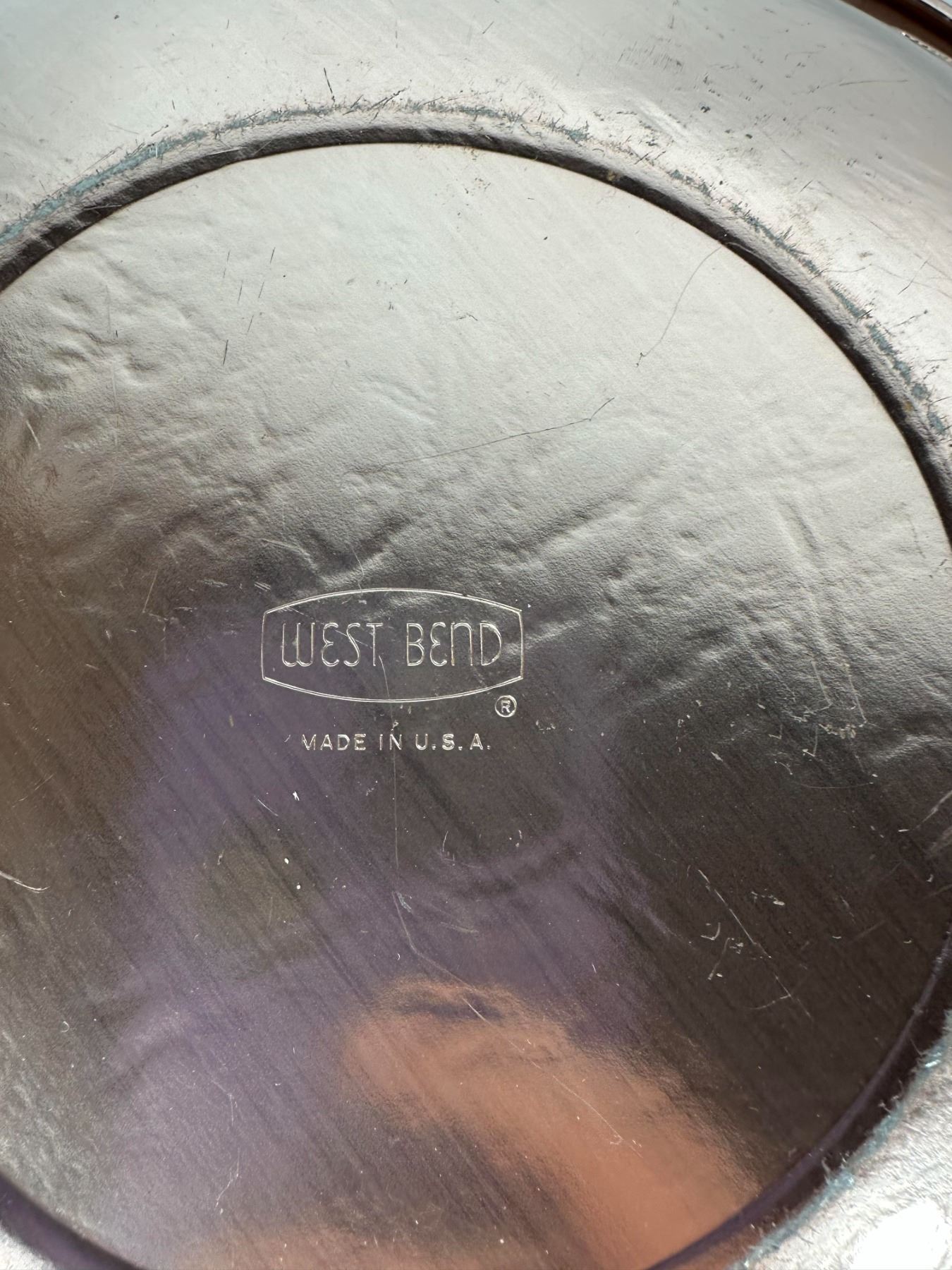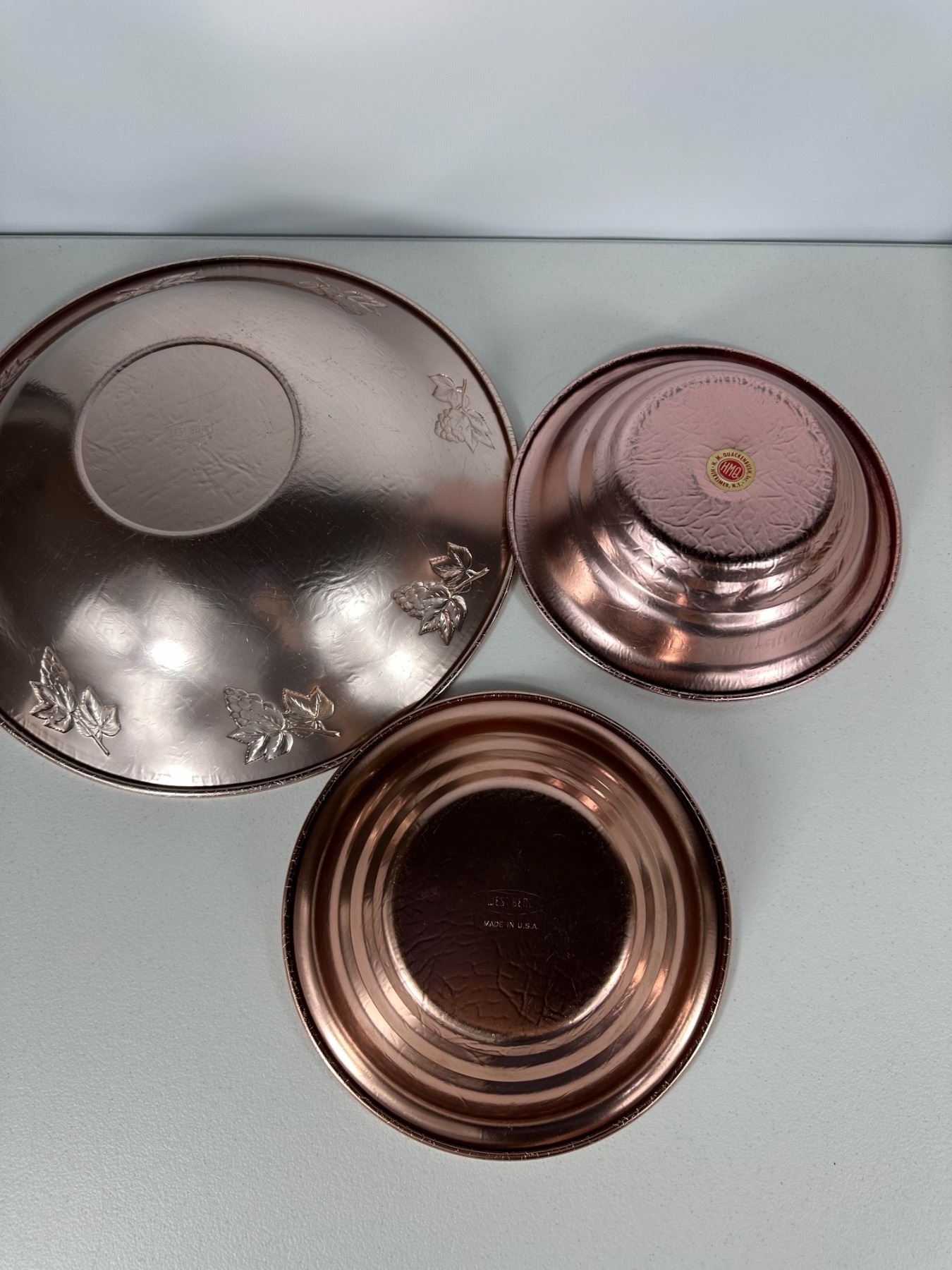 A vintage set of three nesting bowls by West Bend, Made in U.S.A.. Each has a striking copper-toned metallic finish with textured crackle surface. Diameters range from small to large, perfect for kitchen display or retro décor. Condition shows light age wear, consistent with use.